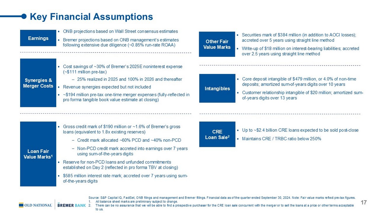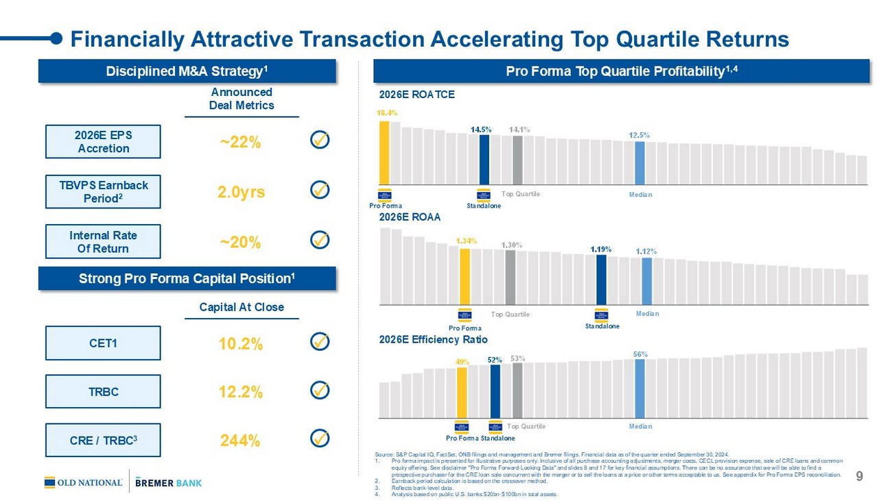 Key Transaction Terms 8 8 Transaction Structure Bremer shareholders will receive 4.182 ONB shares (fixed exchange ratio) and $26.22 per share in cash for each Bremer share – Aggregate consideration to Bremer shareholders equates to approximately 50 million shares of ONB and $315 million in cash Approximately 78% stock and 22% cash consideration Pro forma ownership: ~81.6% ONB, ~12.8% Bremer and ~5.6% new shareholders 1 Approvals & Timing Approval of Bremer shareholders required – Otto Bremer Trust will enter into a voting agreement at signing to approve the transaction (86% voting control of Bremer shar es) Customary regulatory approvals Anticipated closing in the middle of 2025 Board Representation Otto Bremer Trust to appoint one Trustee to Old National Bancorp Board of Directors Transaction Value 2 Deal value of ~$1.401 billion Price / TBV: 1.00x Price / 2025E EPS: 9.7x Price / 2025E EPS with cost savings: 6.1x 3 Source: S &P Capital IQ, ONB filings and management and Bremer filings . Financial data as of the quarter ended September 30, 2024 . Pro forma impact is presented for illustrative purposes only. See disclaimer “Pro Forma Forward - Looking Data” and slides 8 and 17 for key financial assumptions. 1. Pro forma ownership assumes common equity raise base offering of $400M at $21.00, full exercise of 15% greenshoe and full ph ysical settlement for illustrative purposes. 2. Based on ONB’s closing stock price on November 22, 2024 of $21.65. 3. Includes impac t f rom ~$111M pre - tax fully phased - in cost savings in 2025. Common Equity Raise $400 million common equity offering Forward settlement mechanism to provide flexibility around settlement amount and date
