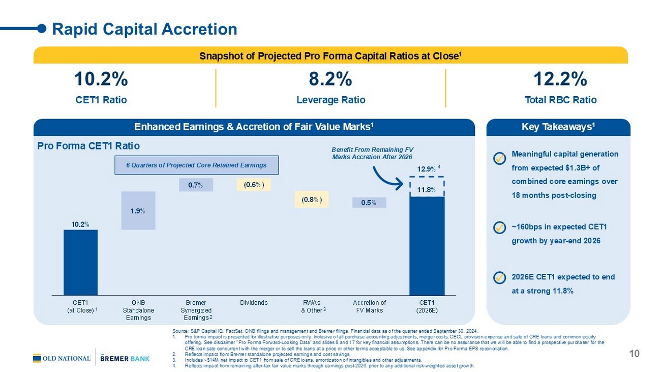 49% 52% 53% 56% 1.34% 1.30% 1.19% 1.12% 18.4% 14.5% 14.1% 12.5% 9 Pro Forma Top Quartile Profitability 1,4 2026E ROAA 2026E ROATCE 2026E Efficiency Ratio Standalone Standalone Standalone Financially Attractive Transaction Accelerating Top Quartile Returns Pro Forma Pro Forma Pro Forma Top Quartile Top Quartile Top Quartile Disciplined M&A Strategy 1 Strong Pro Forma Capital Position 1 ~20% Median Median Median 2.0yrs ~22% 2026E EPS Accretion TBVPS Earnback Period 2 Internal Rate Of Return Announced Deal Metrics Source: S&P Capital IQ, FactSet, ONB filings and management and Bremer filings. Financial data as of the quarter ended Septem ber 30, 2024. 1. Pro forma impact is presented for illustrative purposes only. Inclusive of all purchase accounting adjustments, merger costs, CECL provision expense, sale of CRE loans and common equity offering. See disclaimer "Pro Forma Forward - Looking Data" and slides 8 and 17 for key financial assumptions . There can be no assurance that we will be able to find a prospective purchaser for the CRE loan sale concurrent with the merger or to sell the loans at a price or other terms accepta ble to us. See appendix for Pro Forma EPS reconciliation. 2. Earnback period calculation is based on the crossover method. 3. Reflects bank - level data. 4. Analysis based on public U.S. banks $20bn - $100bn in total assets. 10.2% CET1 12.2% TRBC 244% CRE / TRBC 3 Capital At Close