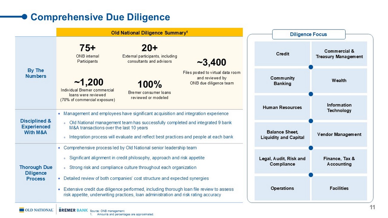 10.2% 11.8% 1.9% 0.7% 0.5% 12.9% (0.6%) (0.8%) CET1 (at Close) ONB Standalone Earnings Bremer Synergized Earnings Dividends RWAs & Other Accretion of FV Marks CET1 (2026E) Rapid Capital Accretion 10 Enhanced Earnings & Accretion of Fair Value Marks 1 6 Quarters of Projected Core Retained Earnings Benefit From Remaining FV Marks Accretion After 2026 Pro Forma CET1 Ratio 1 4 2 3 Leverage Ratio 8.2% CET1 Ratio 10.2% Total RBC Ratio 12.2% Key Takeaways 1 Snapshot of Projected Pro Forma Capital Ratios at Close 1 Source: S&P Capital IQ, FactSet, ONB filings and management and Bremer filings. Financial data as of the quarter ended Septem ber 30, 2024 . 1. Pro forma impact is presented for illustrative purposes only. Inclusive of all purchase accounting adjustments, merger costs, CE CL provision expense and sale of CRE loans and common equity offering. See disclaimer "Pro Forma Forward - Looking Data" and slides 8 and 17 for key financial assumptions. There can be no assurance that we will be able to find a prospective purchaser for the CRE loan sale concurrent with the merger or to sell the loans at a price or other terms acceptable to us. See appendix for Pro Forma EPS reconciliation. 2. Reflects impact from Bremer standalone projected earnings and cost savings. 3. Includes ~$14M net impact to CET1 from sale of CRE loans, amortization of intangibles and other adjustments. 4. Reflects impact from remaining after - tax fair value marks through earnings post - 2026 , prior to any additional risk - weighted asset growth. Meaningful capital generation from expected $1.3B+ of combined core earnings over 18 months post - closing ~160bps in expected CET1 growth by year - end 2026 2026E CET1 expected to end at a strong 11.8%