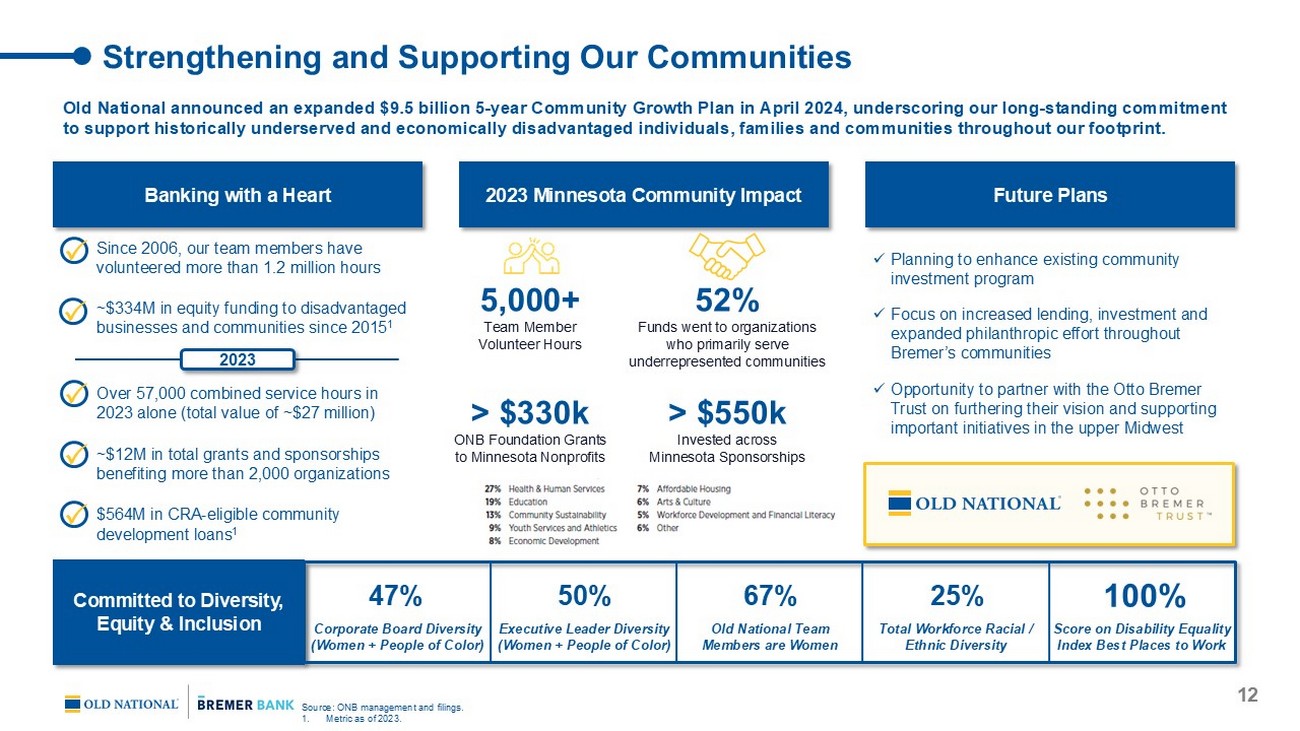 Comprehensive Due Diligence Old National Diligence Summary 1 ~3,400 Files posted to virtual data room and reviewed by ONB due diligence team 20+ External participants, including consultants and advisors 75+ ONB internal Participants By The Numbers 100% Bremer consumer loans reviewed or modeled ~1,200 Individual Bremer commercial loans were reviewed (70% of commercial exposure) • Management and employees have significant acquisition and integration experience ○ Old National management team has successfully completed and integrated 9 bank M&A transactions over the last 10 years ○ Integration process will evaluate and reflect best practices and people at each bank Disciplined & Experienced With M&A • Comprehensive process led by Old National senior leadership team ○ Significant alignment in credit philosophy, approach and risk appetite ○ Strong risk and compliance culture throughout each organization • Detailed review of both companies’ cost structure and expected synergies • Extensive credit due diligence performed, including thorough loan file review to assess risk appetite, underwriting practices, loan administration and risk rating accuracy Thorough Due Diligence Process 11 Operations Facilities Diligence Focus Credit Commercial & Treasury Management Community Banking Wealth Human Resources Information Technology Balance Sheet, Liquidity and Capital Vendor Management Legal, Audit, Risk and Compliance Finance, Tax & Accounting Source: ONB management. 1. Amounts and percentages are approximated.