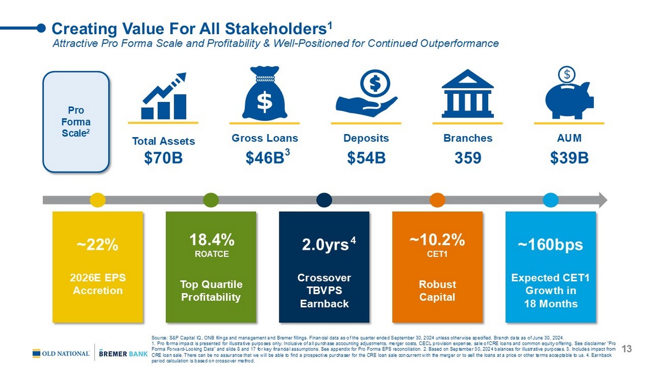 12 Strengthening and Supporting Our Communities Old National announced an expanded $9.5 billion 5 - year Community Growth Plan in April 2024, underscoring our long - standing commi tment to support historically underserved and economically disadvantaged individuals, families and communities throughout our footp rin t. Committed to Diversity, Equity & Inclusion 47% 50% 67% 25% 100% Corporate Board Diversity (Women + People of Color) Executive Leader Diversity (Women + People of Color) Old National Team Members are Women Total Workforce Racial / Ethnic Diversity Score on Disability Equality Index Best Places to Work 2023 Minnesota Community Impact Future Plans x Planning to enhance existing community investment program x Focus on increased lending, investment and expanded philanthropic effort throughout Bremer’s communities x Opportunity to partner with the Otto Bremer Trust on furthering their vision and supporting important initiatives in the upper Midwest Banking with a Heart > $330k ONB Foundation Grants to Minnesota Nonprofits > $550k Invested across Minnesota Sponsorships 5,000+ Team Member Volunteer Hours 52% Funds went to organizations who primarily serve underrepresented communities Since 2006, our team members have volunteered more than 1.2 million hours ~$334M in equity funding to disadvantaged businesses and communities since 2015 1 Over 57,000 combined service hours in 2023 alone (total value of ~$27 million) ~$12M in total grants and sponsorships benefiting more than 2,000 organizations $564M in CRA - eligible community development loans 1 Source: ONB management and filings. 1. Metric as of 2023. 2023