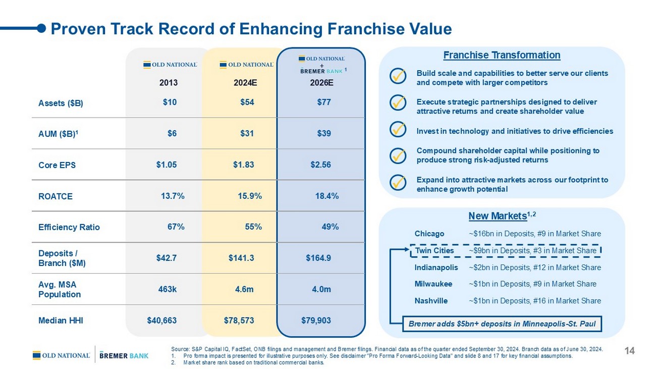 Creating Value For All Stakeholders 1 Attractive Pro Forma Scale and Profitability & Well - Positioned for Continued Outperformance ~22% 2026E EPS Accretion 2.0yrs Crossover TBVPS Earnback 18.4% ROATCE Top Quartile Profitability ~10.2% CET1 Robust Capital ~160bps Expected CET1 Growth in 18 Months Branches 359 Gross Loans $46B Deposits $54B 13 Source: S&P Capital IQ, ONB filings and management and Bremer fillings . Financial data as of the quarter ended September 30, 2024 unless otherwise specified . Branch data as of June 30, 2024. 1. Pro forma impact is presented for illustrative purposes only. Inclusive of all purchase accounting adjustments, merger cos ts, CECL provision expense, sale of CRE loans and common equity offering. See disclaimer "Pro Forma Forward - Looking Data" and slide 8 and 17 for key financial assumptions. See appendix for Pro Forma EPS reconciliation. 2. Based on September 30, 2024 balances for illustrative purposes. 3. Includes impact from CRE loan sale. There can be no assurance that we will be able to find a prospective purchaser for the CRE loan sale concurrent with the merg er or to sell the loans at a price or other terms acceptable to us. 4. Earnback period calculation is based on crossover method. 4 Total Assets $70B AUM $39B 3 Pro Forma Scale 2