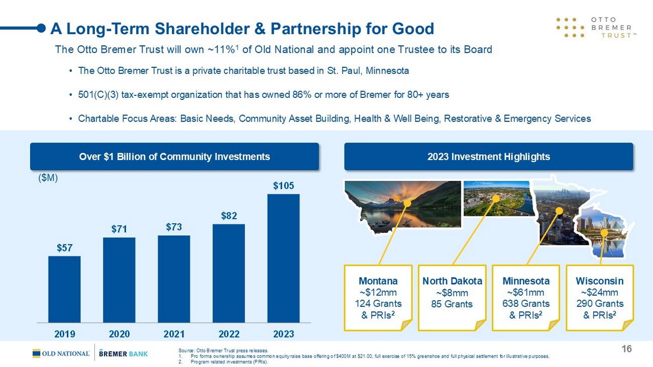 $57 $71 $73 $82 $105 2019 2020 2021 2022 2023 The Otto Bremer Trust will own ~11% 1 of Old National and appoint one Trustee to its Board A Long - Term Shareholder & Partnership for Good 16 • The Otto Bremer Trust is a private charitable trust based in St. Paul, Minnesota • 501(C)(3) tax - exempt organization that has owned 86% or more of Bremer for 80+ years • Chartable Focus Areas: Basic Needs, Community Asset Building, Health & Well Being, Restorative & Emergency Services Over $1 Billion of Community Investments 2023 Investment Highlights Minnesota ~$61mm 638 Grants & PRIs 2 Montana ~$12mm 124 Grants & PRIs 2 North Dakota ~$8mm 85 Grants Wisconsin ~$24mm 290 Grants & PRIs 2 ($M) Source: Otto Bremer Trust press releases . 1. Pro forma ownership assumes common equity raise base offering of $400M at $21.00, full exercise of 15% greenshoe and full phy sic al settlement for illustrative purposes. 2. Program related investments (PRIs).