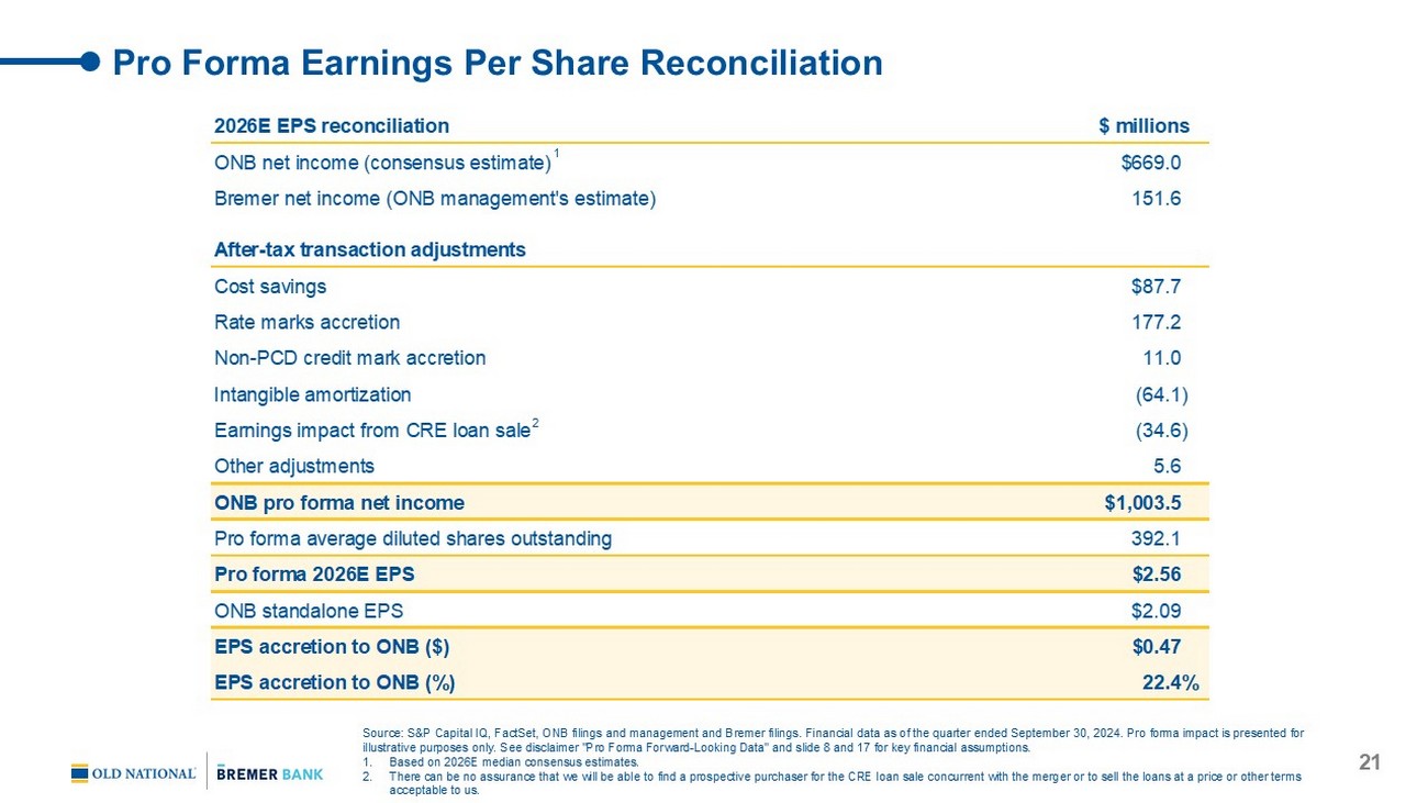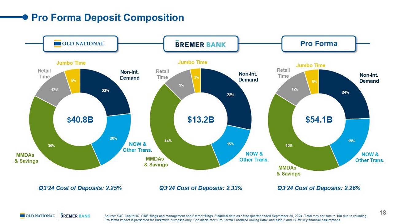 Key Financial Assumptions 17 17 Earnings ONB projections based on Wall Street consensus estimates Bremer projections based on ONB management’s estimates following extensive due diligence (~0.85% run - rate ROAA) Source: S&P Capital IQ, FactSet, ONB filings and management and Bremer fillings . Financial data as of the quarter ended September 30, 2024 . Note: Fair value marks reflect pre - tax figures. 1. All balance sheet marks are preliminary subject to change. 2. There can be no assurance that we will be able to find a prospective purchaser for the CRE loan sale concurrent with the merg er or to sell the loans at a price or other terms acceptable to us. Synergies & Merger Costs Cost savings of ~30% of Bremer’s 2025E noninterest expense (~$111 million pre - tax) – 25% realized in 2025 and 100% in 2026 and thereafter Revenue synergies expected but not included ~$194 million pre - tax one - time merger expenses (fully - reflected in pro forma tangible book value estimate at closing) Intangibles Core deposit intangible of $479 million, or 4.0% of non - time deposits; amortized sum - of - years digits over 10 years Customer relationship intangible of $20 million; amortized sum - of - years digits over 13 years Loan Fair Value Marks 1 Gross credit mark of $190 million or ~1.6% of Bremer’s gross loans (equivalent to 1.8x existing reserves) Credit mark allocated ~60% PCD and ~40% non - PCD Non - PCD credit mark accreted into earnings over 7 years using sum - of - the - years digits Reserve for non - PCD loans and unfunded commitments established on Day 2 (reflected in pro forma TBV at closing) $585 million interest rate mark; accreted over 7 years using sum - of - the - years digits Other Fair Value Marks Securities mark of $384 million (in addition to AOCI losses); accreted over 5 years using straight line method Write - up of $18 million on interest - bearing liabilities; accreted over 2.5 years using straight line method CRE Loan Sale 2 Up to ~$2.4 billion CRE loans expected to be sold post - close Maintains CRE / TRBC ratio below 250%