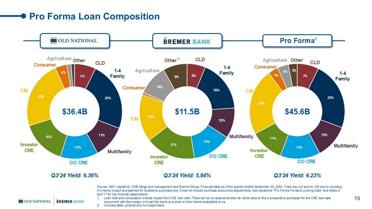 28% 15% 44% 9% 3% 23% 20% 39% 12% 5% Pro Forma Deposit Composition $ 40.8B $13.2B $54.1B Source: S&P Capital IQ, ONB filings and management and Bremer filings . Financial data as of the quarter ended September 30, 2024 . Total may not sum to 100 due to rounding. Pro forma impact is presented for illustrative purposes only. See disclaimer "Pro Forma Forward - Looking Data" and slide 8 and 17 for key financial assumptions. Q3‘24 Cost of Deposits: 2.25% Q3‘24 Cost of Deposits: 2.33% Q3‘24 Cost of Deposits: 2.26% Pro Forma Non - Int. Demand NOW & Other Trans. MMDAs & Savings Retail Time Jumbo Time Non - Int. Demand NOW & Other Trans. MMDAs & Savings Retail Time Jumbo Time Non - Int. Demand NOW & Other Trans. MMDAs & Savings Retail Time Jumbo Time 18