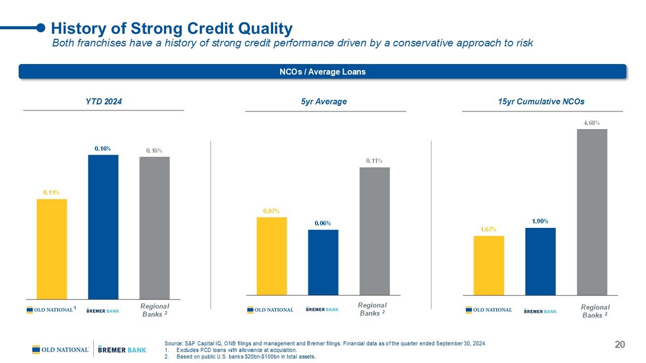 0.07% 0.06% 0.11% ONB Barley Regional Banks 0.11% 0.16% 0.16% ONB Barley Regional Banks History of Strong Credit Quality Both franchises have a history of strong credit performance driven by a conservative approach to risk 15yr Cumulative NCOs Regional Banks 2 5yr Average Regional Banks 2 YTD 2024 Source: S&P Capital IQ, ONB filings and management and Bremer filings. Financial data as of the quarter ended September 30, 2 024 . 1. Excludes PCD loans with allowance at acquisition. 2. Based on public U.S. banks $20bn - $100bn in total assets. 1 Regional Banks 2 NCOs / Average Loans 20