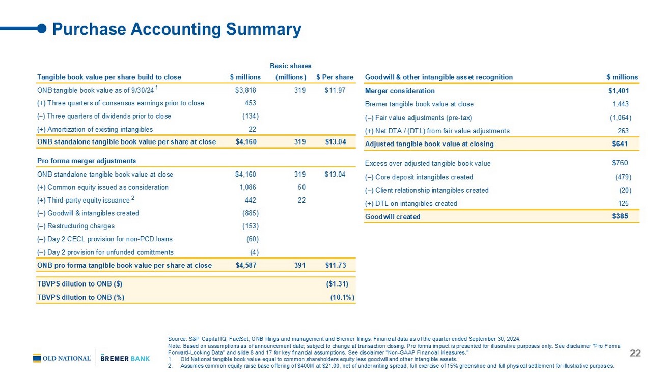 2026E EPS reconciliation $ millions ONB net income (consensus estimate) $669.0 Bremer net income (ONB management's estimate) 151.6 After-tax transaction adjustments Cost savings $87.7 Rate marks accretion 177.2 Non-PCD credit mark accretion 11.0 Intangible amortization (64.1) Earnings impact from CRE loan sale (34.6) Other adjustments 5.6 ONB pro forma net income $1,003.5 Pro forma average diluted shares outstanding 392.1 Pro forma 2026E EPS $2.56 ONB standalone EPS $2.09 EPS accretion to ONB ($) $0.47 EPS accretion to ONB (%) 22.4% Pro Forma Earnings Per Share Reconciliation Source: S&P Capital IQ, FactSet, ONB filings and management and Bremer filings. Financial data as of the quarter ended Septem ber 30, 2024 . Pro forma impact is presented for illustrative purposes only. See disclaimer "Pro Forma Forward - Looking Data" and slide 8 and 17 for key financial assumptions. 1. Based on 2026E median consensus estimates. 2. There can be no assurance that we will be able to find a prospective purchaser for the CRE loan sale concurrent with the merg er or to sell the loans at a price or other terms acceptable to us. 21 1 2