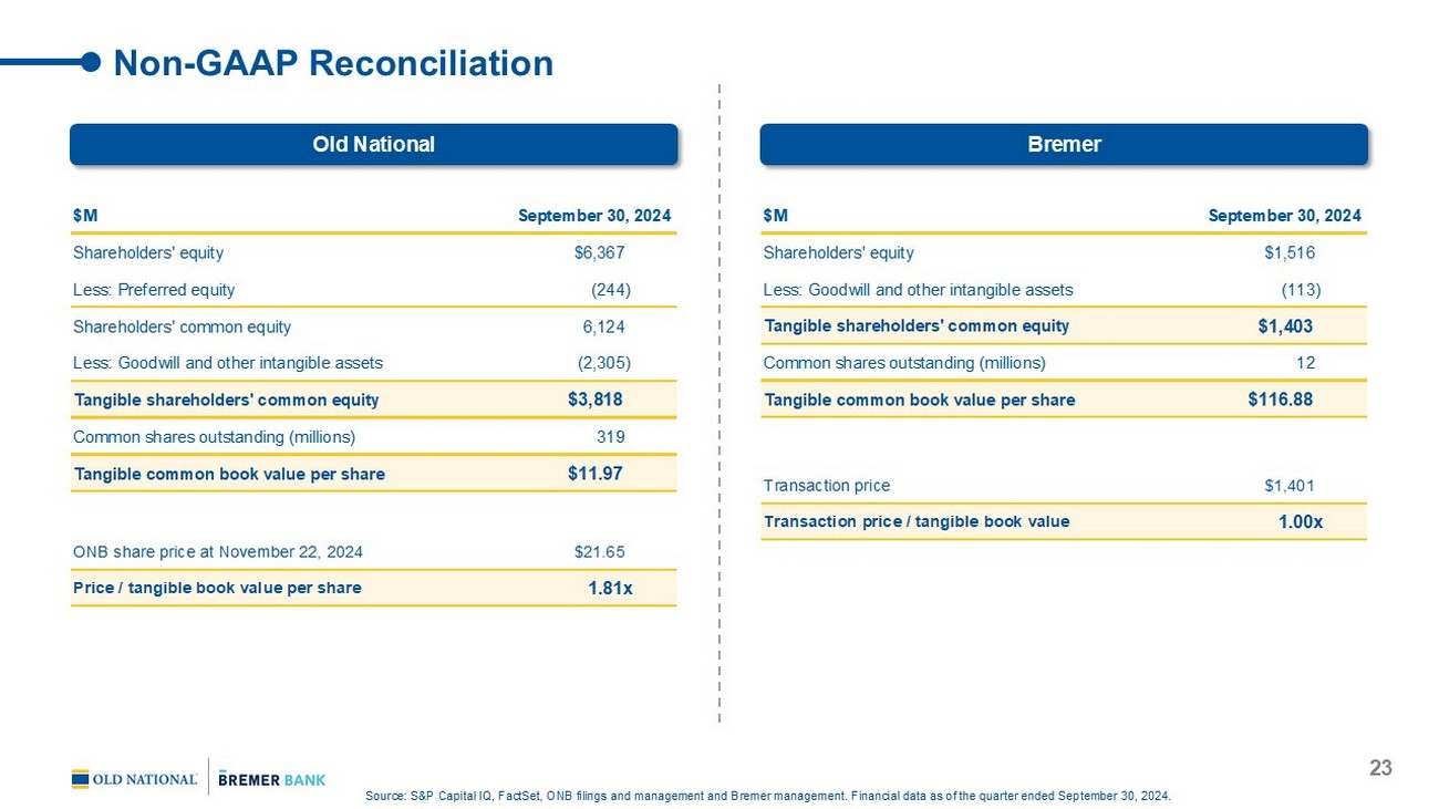 Basic shares Tangible book value per share build to close $ millions (millions) $ Per share ONB tangible book value as of 9/30/24 $3,818 319 $11.97 (+) Three quarters of consensus earnings prior to close 453 ( – ) Three quarters of dividends prior to close (134) (+) Amortization of existing intangibles 22 ONB standalone tangible book value per share at close $4,160 319 $13.04 Pro forma merger adjustments ONB standalone tangible book value at close $4,160 319 $13.04 (+) Common equity issued as consideration 1,086 50 (+) Third-party equity issuance 442 22 (–) Goodwill & intangibles created (885) (–) Restructuring charges (153) (–) Day 2 CECL provision for non-PCD loans (60) (–) Day 2 provision for unfunded comittments (4) ONB pro forma tangible book value per share at close $4,587 391 $11.73 TBVPS dilution to ONB ($) ($1.31) TBVPS dilution to ONB (%) (10.1%) Goodwill & other intangible asset recognition $ millions Merger consideration $1,401 Bremer tangible book value at close 1,443 (–) Fair value adjustments (pre-tax) (1,064) (+) Net DTA / (DTL) from fair value adjustments 263 Adjusted tangible book value at closing $641 Excess over adjusted tangible book value $760 (–) Core deposit intangibles created (479) (–) Client relationship intangibles created (20) (+) DTL on intangibles created 125 Goodwill created $385 Purchase Accounting Summary Source: S&P Capital IQ, FactSet, ONB filings and management and Bremer filings . Financial data as of the quarter ended September 30, 2024 . Note: Based on assumptions as of announcement date; subject to change at transaction closing. Pro forma impact is presented f or illustrative purposes only. See disclaimer "Pro Forma Forward - Looking Data" and slide 8 and 17 for key financial assumptions. See disclaimer "Non - GAAP Financial Measures." 1. Old National tangible book value equal to common shareholders equity less goodwill and other intangible assets. 2. Assumes common equity raise base offering of $400 M at $21.00, net of underwriting spread, full exercise of 15% greenshoe and full physical settlement for illustrative purposes. 1 22 2
