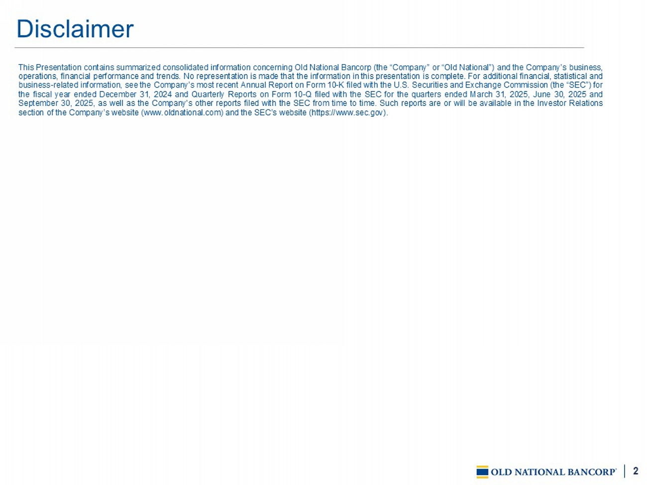 2 This Presentation contains summarized consolidated information concerning Old National Bancorp (the “Company” or “Old National” ) and the Company’s business, operations, financial performance and trends . No representation is made that the information in this presentation is complete . For additional financial, statistical and business - related information, see the Company’s most recent Annual Report on Form 10 - K filed with the U . S . Securities and Exchange Commission (the “SEC”) for the fiscal year ended December 31 , 2024 and Quarterly Reports on Form 10 - Q filed with the SEC for the quarters ended March 31 , 2025 , June 30 , 2025 and September 30 , 2025 , as well as the Company's other reports filed with the SEC from time to time . Such reports are or will be available in the Investor Relations section of the Company’s website (www . oldnational . com) and the SEC’s website (https : //www . sec . gov) . Disclaimer