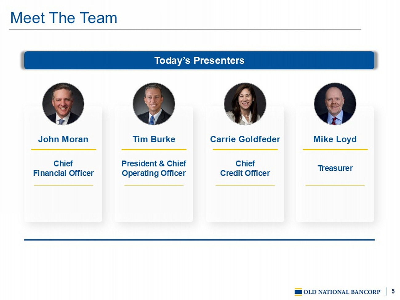 4 Non - GAAP Financial Measures The Company's accounting and reporting policies conform to U . S . generally accepted accounting principles ("GAAP") and general practices within the banking industry . As a supplement to GAAP, the Company provides non - GAAP financial measures , which the Company believes are useful because they assist management and investors in assessing the Company's operating performance . Where non - GAAP financial measures are used, the comparable GAAP financial measure, as well as the reconciliation to the comparable GAAP financial measure, can be found in the A ppendix to this Presentation . The Company presents earnings per diluted common share (“EPS”) , the efficiency ratio, return on average common equity, return on average tangible common equity, and net income applicable to common shares, all adjusted for certain notable items . These items include merger - related charges associated with completed and pending acquisitions, Current Expected Credit Loss (“ CECL “) Day 1 non - Purchased Credit Deteriorated (“ PCD “) provision expense, a pension plan gain /loss , debt securities gains/losses, distribution of excess pension assets expense, and FDIC special assessment expense . Management believes excluding these items from EPS, the efficiency ratio, return on average common equity, and return on average tangible common equity may be useful in assessing the Company's underlying operational performance since these items do not pertain to its core business operations and their exclusion may facilitate better comparability between periods . Management believes that excluding merger - related charges from these metrics may be useful to the Company, as well as analysts and investors, since these expenses can vary significantly based on the size, type, and structure of each acquisition . Additionally, management believes excluding these items from these metrics may enhance comparability for peer comparison purposes . Income tax expense, provision for credit losses, and the certain notable items listed above are excluded from the calculation of pre - provision net revenues, adjusted due to the fluctuation in income before income tax and the level of provision for credit losses required . Management believes adjusted pre - provision net revenues may be useful in assessing the Company's underlying operating performance and their exclusion may facilitate better comparability between periods and for peer comparison purposes . The Company presents adjusted noninterest expense, which excludes merger - related charges associated with completed and pending acquisitions , distribution of excess pension assets expense, and FDIC special assessment expense, as well as adjusted noninterest income, which excludes a pension plan gain /loss and debt securities gains/losses . Management believes that excluding these items from noninterest expense and noninterest income may be useful in assessing the Company’s underlying operational performance as these items either do not pertain to its core business operations or their exclusion may facilitate better comparability between periods and for peer comparison purposes . The tax - equivalent adjustment to net interest income and net interest margin recognizes the income tax savings when comparing taxable and tax - exempt assets . Interest income and yields on tax - exempt securities and loans are presented using the current federal income tax rate of 21 % . Management believes that it is standard practice in the banking industry to present net interest income and net interest margin on a fully tax - equivalent basis and that it may enhance comparability for peer comparison purposes . In management's view, tangible common equity measures are capital adequacy metrics that may be meaningful to the Company, as well as analysts and investors, in assessing the Company's use of equity and in facilitating comparisons with peers . These non - GAAP financial measures are valuable indicators of a financial institution's capital strength since they eliminate intangible assets from shareholders ' equity and retain the effect of accumulated other comprehensive loss in shareholders ' equity . Although intended to enhance investors' understanding of the Company's business and performance, these non - GAAP financial measures should not be considered an alternative to GAAP . In addition, these non - GAAP financial measures may differ from those used by other financial institutions to assess their business and performance . See "Non - GAAP Reconciliations" in the Appendix to this Presentation for details on the calculation of these measures to the extent presented herein .