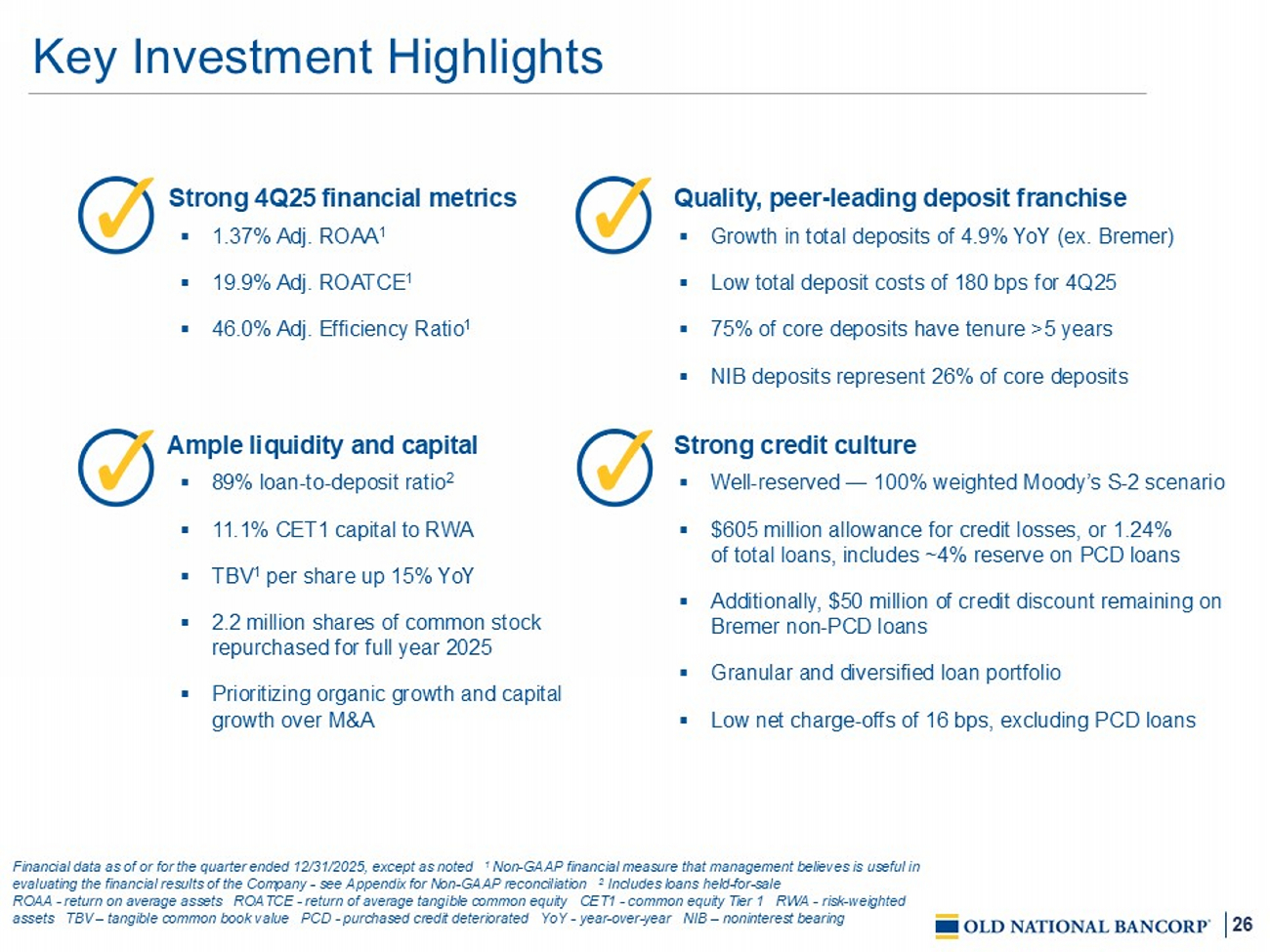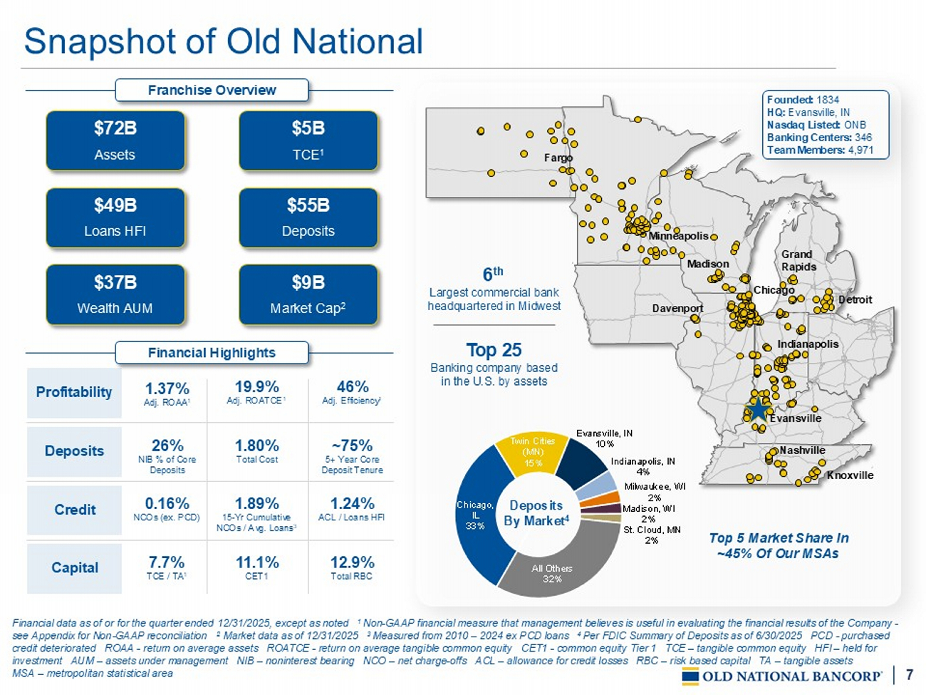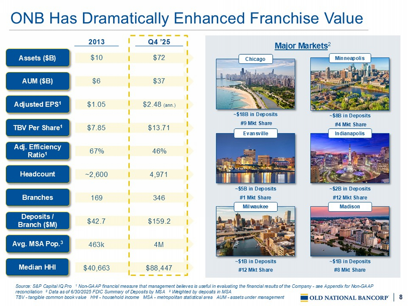 7 Snapshot of Old National Financial data as of or for the quarter ended 12 /3 1 /2025, except as noted 1 Non - GAAP financial measure that management believes is useful in evaluating the financial results of the Company - see Appendix for Non - GAAP reconciliation 2 Market data as of 12/31/2025 3 Measured from 2010 – 2024 ex PCD loans 4 Per FDIC Summary of Deposits as of 6/30/2025 PCD - purchased credit deteriorated ROAA - return on average assets ROATCE - r eturn on average tangible common equity CET1 - common equity Tier 1 TCE – tangible common equity HFI – held for investment AUM – assets under management NIB – noninterest bearing NCO – net charge - offs ACL – allowance for credit loss es RBC – risk based capital TA – tangible assets MSA – metropolitan statistical area $72B Assets $5B TCE 1 $49B Loans HFI $55B Deposits $9B Market Cap 2 6 th Largest commercial bank headquartered in Midwest $37B Wealth AUM Franchise Overview Financial Highlights 1.37% Adj. ROAA 1 19.9% Adj. ROATCE 1 46% Adj. Efficiency 1 Profitability 26% NIB % of Core Deposits 1.80% Total Cost ~75% 5+ Year Core Deposit Tenure Deposits 0.16% NCOs (ex. PCD) 1.89% 15 - Yr Cumulative NCOs / Avg. Loans 3 1.24% ACL / Loans HFI Credit 7.7% TCE / TA 1 11.1% CET1 12.9% Total RBC Capital Top 5 Market Share In ~45% Of Our MSAs Chicago Detroit Nashville Knoxville Indianapolis Minneapolis Madison Evansville Davenport Fargo Grand Rapids Chicago, IL 33% Twin Cities (MN) 15% Evansville, IN 10% Indianapolis, IN 4% Milwaukee, WI 2% Madison, WI 2% St. Cloud, MN 2% All Others 32% Deposits By Market 4 Founded: 1834 HQ: Evansville, IN Nasdaq Listed: ONB Banking Centers: 346 Team Members: 4,971 Top 25 Banking company based in the U.S. by assets