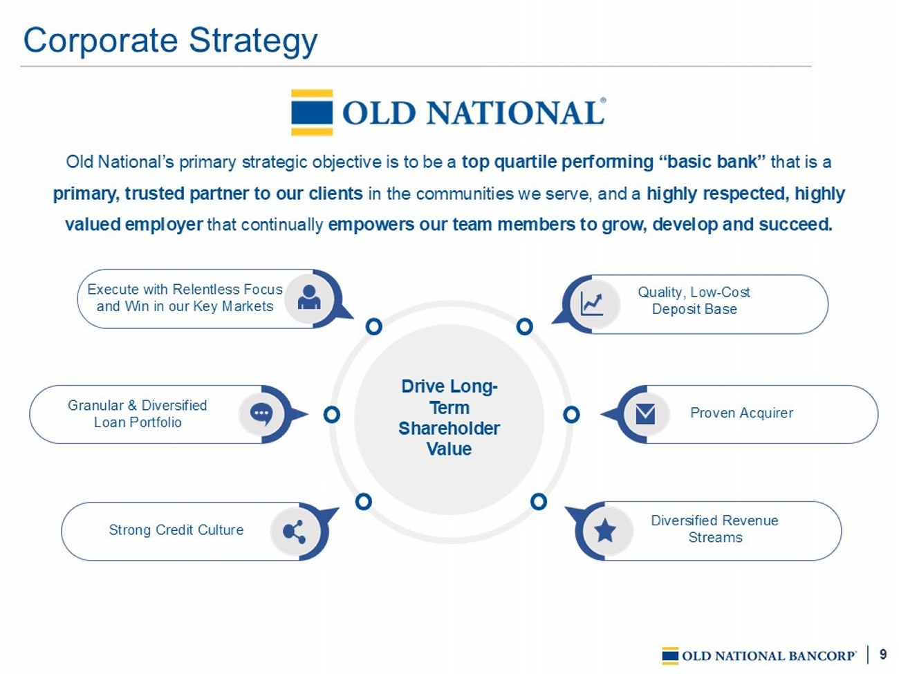 8 ONB H as Dramatically Enhanced Franchise Value Q4 ’25 2013 $7 2 $10 $3 7 $6 $ 2.48 (ann.) $1.05 $13. 71 $7.85 46 % 67% 4,971 ~2,600 3 46 169 $15 9.2 $42.7 4 M 463k $8 8 , 44 7 $40,663 Assets ($B) AUM ($B) Adjusted EPS 1 TBV Per Share 1 Adj. Efficiency Ratio 1 Headcount Branches Deposits / Branch ($M) Avg. MSA Pop. 3 Median HHI Source: S&P Capital IQ Pro 1 Non - GAAP financial measure that management believes is useful in evaluating the financial results of the Company - see Appendix for Non - GAAP reconciliation 2 Data as of 6/30/2025 FDIC Summary of Deposits by MSA 3 Weighted by deposits in MSA TBV - tangible common book value HHI - household income MSA - metropolitan statistical area AUM - assets under management Major Markets 2 Evansville Minneapolis Chicago Indianapolis Milwaukee ~$1B in Deposits #12 Mkt Share ~$ 2B in Deposits #12 Mkt Share ~$ 5 B in Deposits #1 Mkt Share ~$18B in Deposits #9 Mkt Share ~$8B in Deposits #4 Mkt Share Madison ~$1B in Deposits #8 Mkt Share