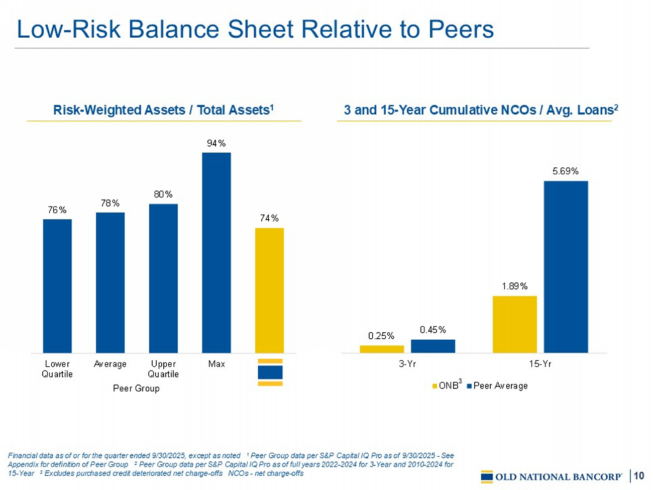 18 $20 $20 $25 $24 $24 $15 $15 $21 $22 $22 $4 $4 $6 $6 $5 $2 $2 $3 $3 $4 $41 $41 $54 $55 $55 4Q24 1Q25 2Q25 3Q25 4Q25 Retail Commercial Public Brokered Quality, Low - Cost Deposit Franchise $ in billions 1 Includes the estimate of Old National Bank federally uninsured deposit balances for regulatory purposes, as adjusted for affi lia te deposits and collateralized or otherwise insured deposits 2 Weighted average rate at end of period NIB - noninterest - bearing NIB 24% Checking & NOW 17% Savings 9% Money Market 29% Time Deposits 14% Brokered 7% Period - End Deposit Composition Deposits By Customer Type 28% Uninsured 1 $55B Total ~8% Top 20 Clients % of Total ~80% Accounts <$25k balance ~75% Deposits 5+ Yr Tenure Deposit Cost Trends 2.01% 2.16% 2.25% 2.08% 1.91% 1.93% 1.97% 1.80% 4.37% 4.27% 3.92% 3.44% 3.34% 3.19% 2.99% 2.59% 1Q24 2Q24 3Q24 4Q24 1Q25 2Q25 3Q25 4Q25 Cost of Deposits Exception Pricing 2 Recent Performance Drivers • NIB deposits represent 26% of core deposits • Spot rate of 1.68 % on total deposits at December 31, 2025 • 36% of total deposits are exception priced at an average rate 2 of 2.59% at December 31, 2025 – Achieved ~87% beta for exception priced deposits 93% Core