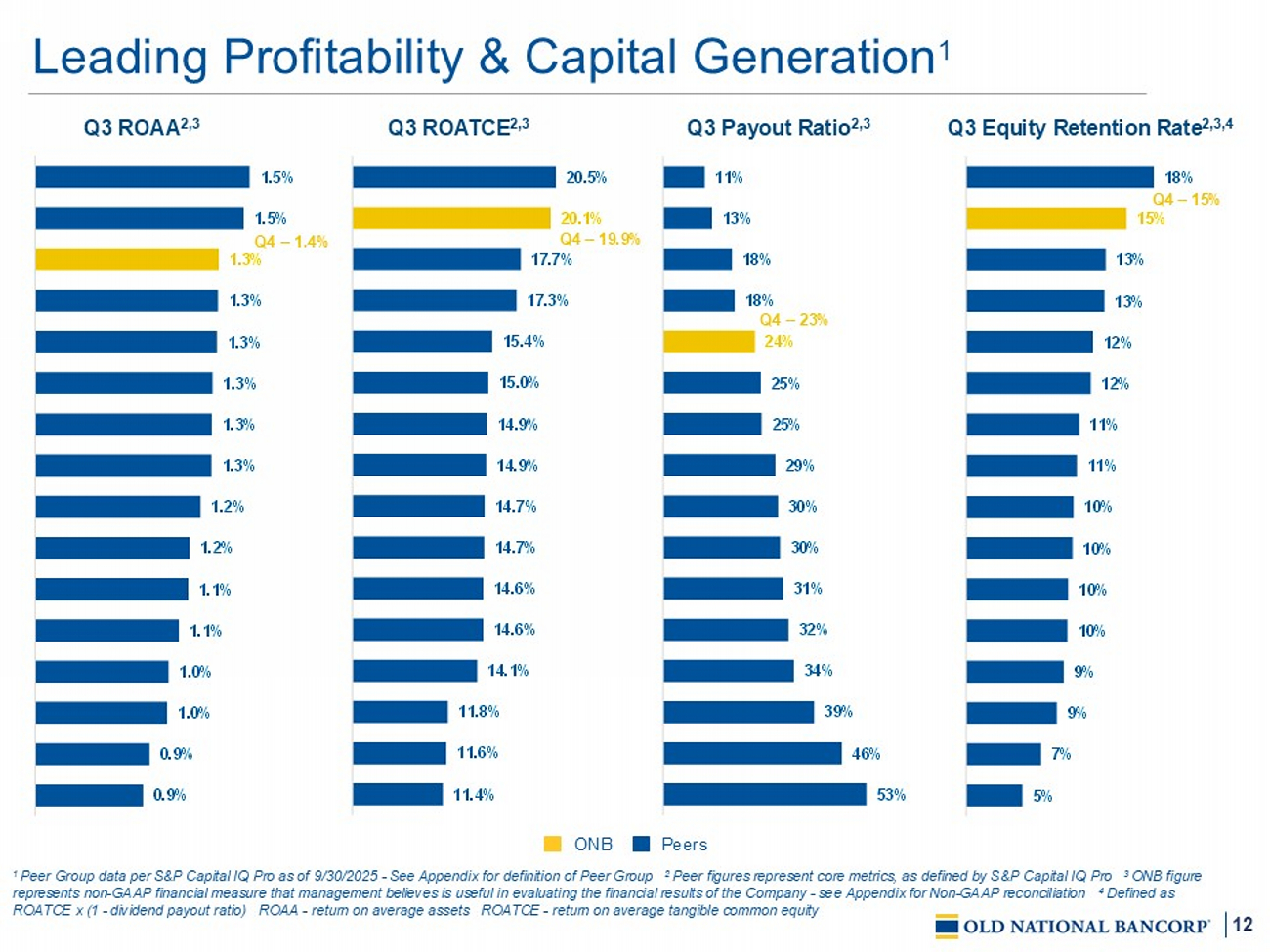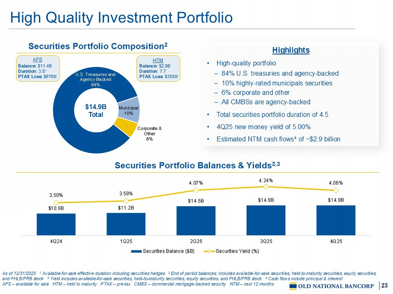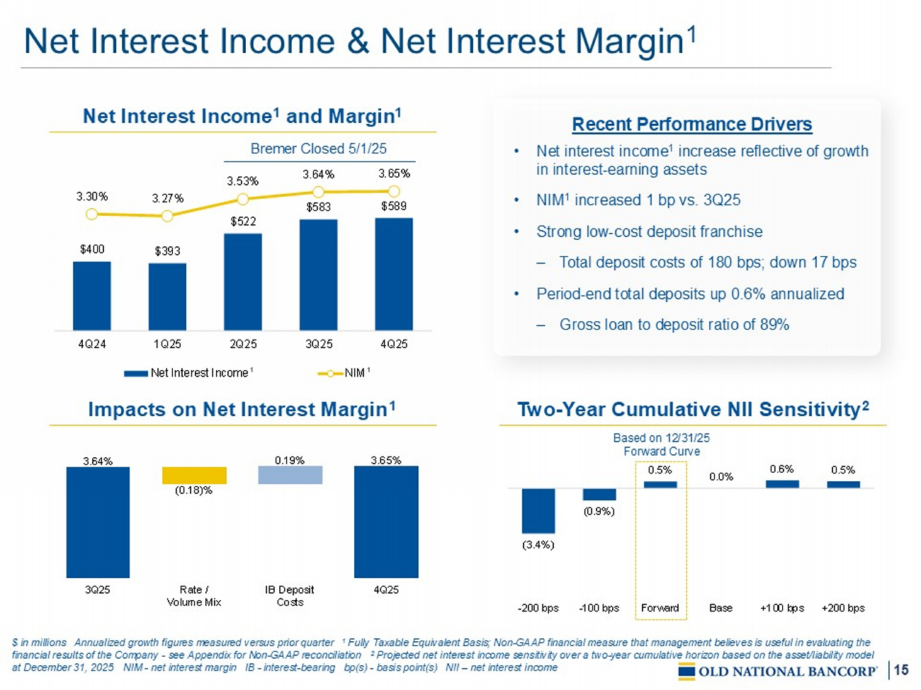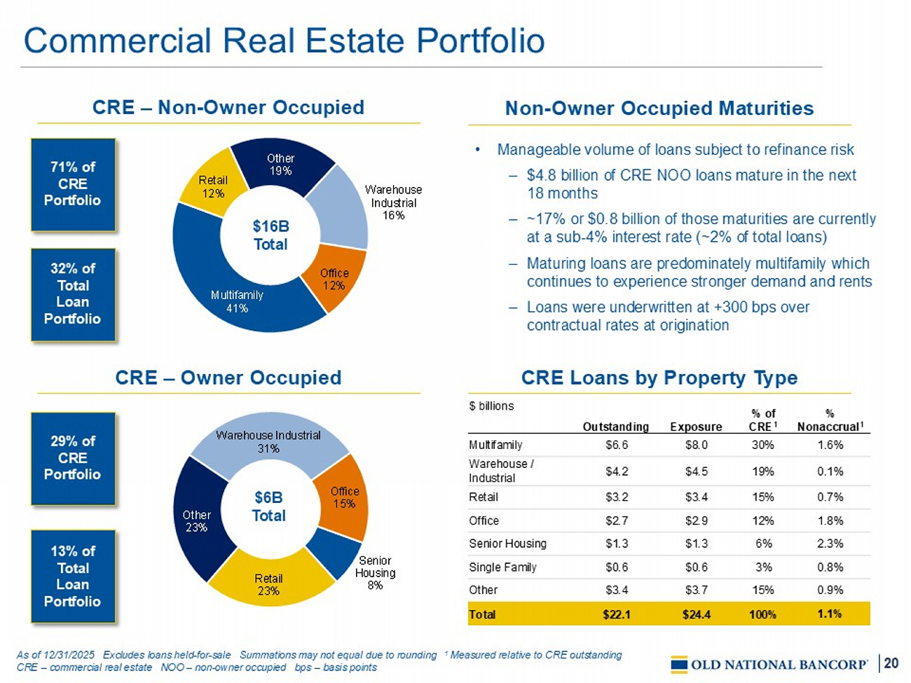 19 $10 $11 $15 $15 $15 $4 $4 $6 $6 $6 $12 $12 $16 $16 $16 $7 $7 $8 $8 $8 $3 $3 $3 $3 $3 $36 $36 $48 $48 $49 4Q24 1Q25 2Q25 3Q25 4Q25 C&I CRE - OO CRE - Non OO Residential Consumer Diversified Loan Portfolio 6.14% 5.83% 6.16% 6.28% 6.14% $ in billions Excludes loans held - for - sale Summations may not equal due to rounding Annualized growth figures measured versus prior quarter 1 CRE as defined in the regulatory agencies guidance on CRE and is sourced from bank call report. Includes C&D, multifamily and non - owner occupied CRE loans 2 Includes 1 – 4 family construction 3 Defined as a state with ONB branch location C&I – commercial & industrial CRE – commercial real estate OO – owner occupied RBC – risk based capi tal C&D – construction and land development Loan Portfolio Trends Loan Yield Highlights • 6.4% annualized total loan growth – C&I loan growth of $477.5 million versus 3Q25 – $3.5B total commercial production; up 25% from 3Q25 o 89% floating; avg yield of 5.9% o 11% fixed; avg yield of 6.0% – ~$4.8B total commercial pipeline; up 15% from 3Q25 • De minimis NDFI exposure (less than 1% of the total loan portfolio) Loan Portfolio Geography MN 21% IL 17% IN 11% WI 10% MI 6% TN 5% ND 4% KY 4% TX 3% FL 2% CA 2% All Others 15% 75%+ In - Market 3 17% 32% 13% 31% 7% 259% Bank CRE / RBC 1 43% Bank C&D / RBC 2 Concentration Ratios ~80% CRE In - Market 3