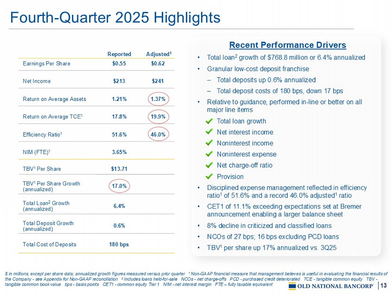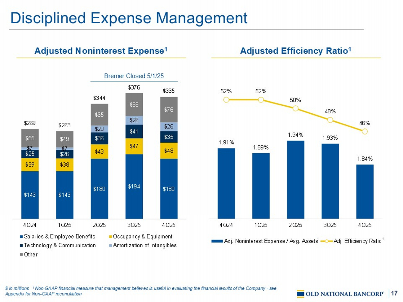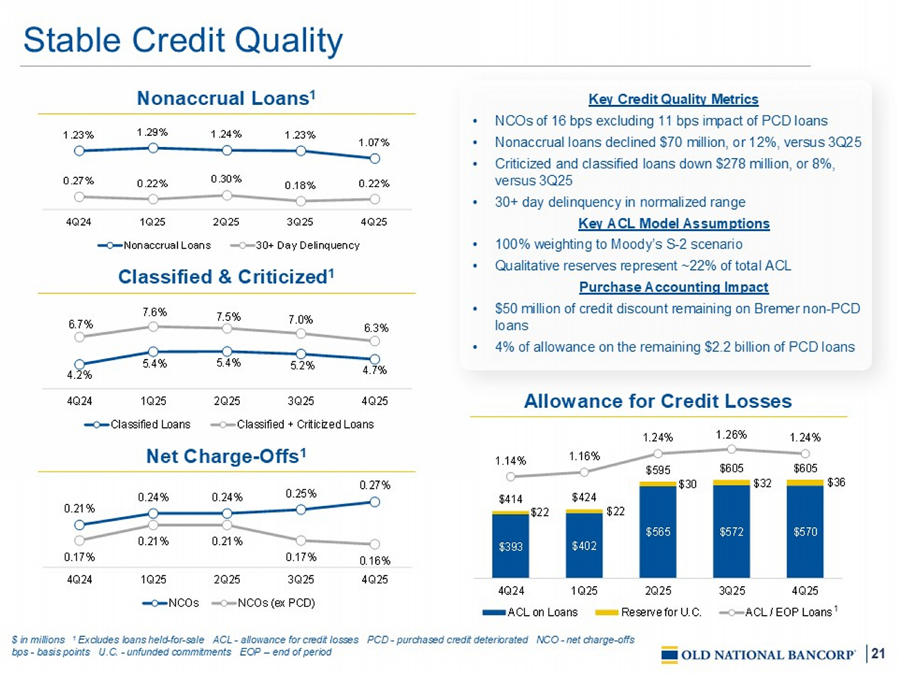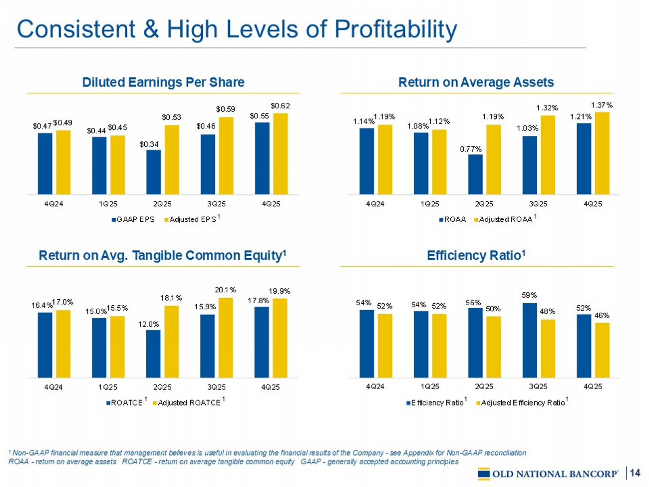 3 This Presentation contains certain "forward - looking statements" within the meaning of the Private Securities Litigation Reform Act of 1995 (the “Act”), Section 27 A of the Securities Act of 1933 and Rule 175 promulgated thereunder, and Section 21 E of the Securities Exchange Act of 1934 and Rule 3 b - 6 promulgated thereunder, notwithstanding that such statements are not specifically identified as such . In addition, certain statements may be contained in our future filings with the SEC, in press releases, and in oral and written statements made by us that are not statements of historical fact and constitute forward - looking statements within the meaning of the Act . These statements include, but are not limited to, descriptions of Old National’s financial condition, results of operations, asset and credit quality trends, profitability and business plans or opportunities . Forward - looking statements can be identified by the use of words such as "anticipate," "believe," "contemplate," "continue," "could," "estimate," "expect," "guidance," "intend," "may," "outlook," "plan," "potential," "predict," "should," "would," and "will," and other words of similar meaning . These forward - looking statements express management’s current expectations or forecasts of future events and, by their nature, are subject to risks and uncertainties . There are a number of factors that could cause actual results or outcomes to differ materially from those in such statements, including, but not limited to : competition ; government legislation, regulations and policies, including trade and tariff policies ; the ability of Old National to execute its business plan ; unanticipated changes in our liquidity position, including but not limited to changes in our access to sources of liquidity and capital to address our liquidity needs ; changes in economic conditions and economic and business uncertainty which could materially impact credit quality trends and the ability to generate loans and gather deposits ; inflation and governmental responses to inflation, including increasing interest rates ; market, economic, operational, liquidity, credit, and interest rate risks associated with our business ; our ability to successfully manage our credit risk and the sufficiency of our allowance for credit losses ; the expected cost savings, synergies and other financial benefits from the merger (the “Merger”) between Old National and Bremer Financial Corporation (“Bremer”) not being realized within the expected time frames and costs or difficulties relating to integration matters being greater than expected ; potential adverse reactions or changes to business or employee relationships, including those resulting from the Merger ; the impact of purchase accounting with respect to the Merger, or any change in the assumptions used regarding the assets acquired and liabilities assumed to determine their fair value and credit marks ; the potential impact of future business combinations on our performance and financial condition, including our ability to successfully integrate the businesses, the success of revenue - generating and cost reduction initiatives and the diversion of management’s attention from ongoing business operations and opportunities ; failure or circumvention of our internal controls ; operational risks or risk management failures by us or critical third parties, including without limitation with respect to data processing, information systems, cybersecurity, technological changes, vendor issues, business interruption, and fraud risks ; significant changes in accounting, tax or regulatory practices or requirements ; new legal obligations or liabilities ; disruptive technologies in payment systems and other services traditionally provided by banks ; failure or disruption of our information systems ; computer hacking and other cybersecurity threats ; the effects of climate change on Old National and its customers, borrowers, or service providers ; the impacts of pandemics, epidemics and other infectious disease outbreaks ; other matters discussed in this earnings release ; and other factors identified in our Annual Report on Form 10 - K for the year ended December 31 , 2024 and other filings with the SEC . These forward - looking statements are based on assumptions and estimates, which although believed to be reasonable, may turn out to be incorrect . Old National does not undertake an obligation to update these forward - looking statements to reflect events or conditions after the date of these materials . You are advised to consult further disclosures we may make on related subjects in our filings with the SEC . Forward - Looking Statements