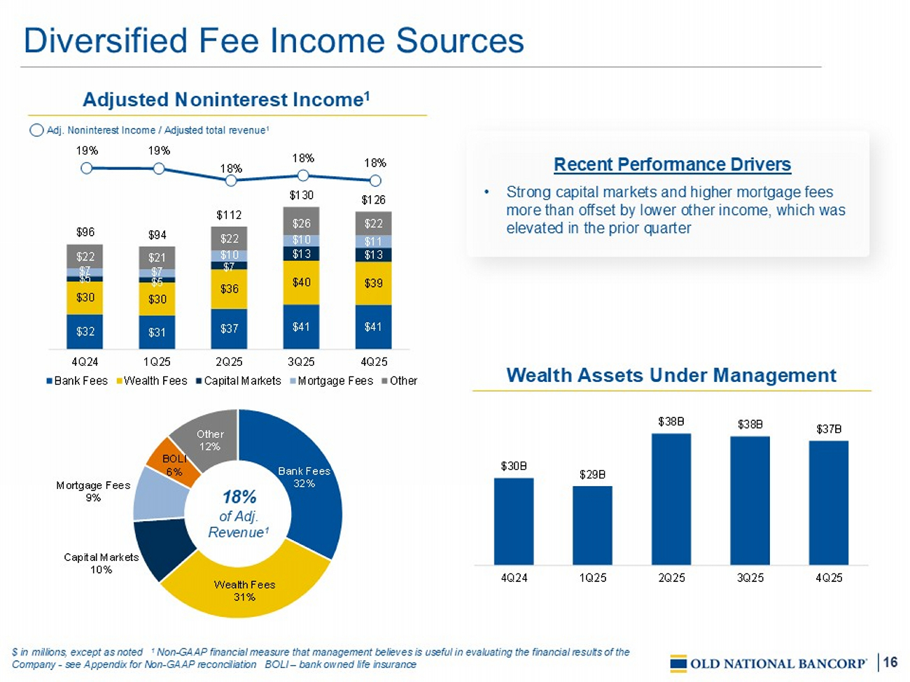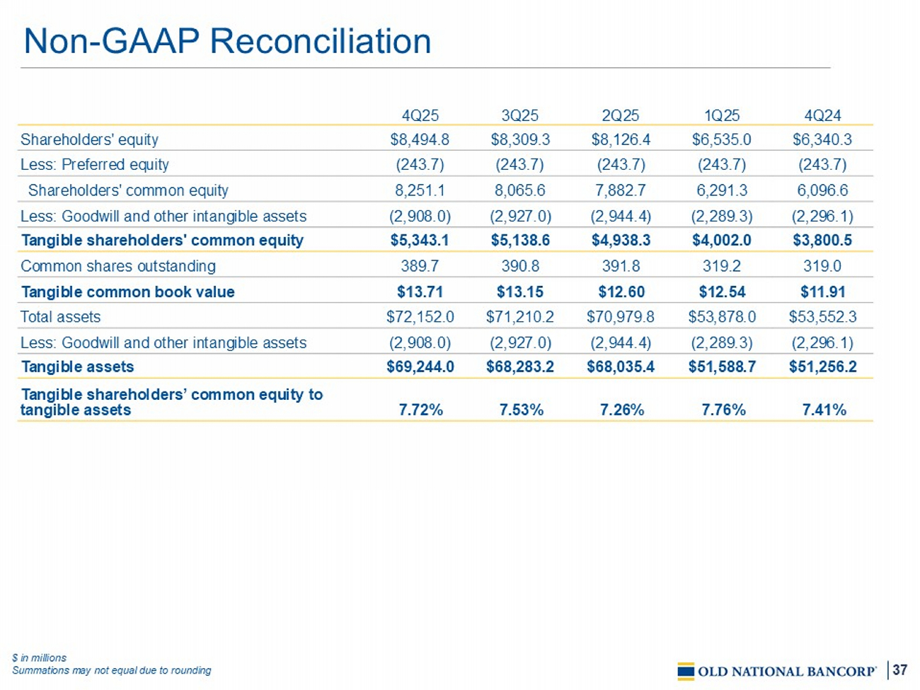 36 Non - GAAP Reconciliation $ in millions Summations may not equal due to rounding 4Q24 1 Q25 2 Q25 3Q25 4Q25 $149.8 $ 140.7 $ 121.4 $178.5 $212.6 Net income applicable to common shares 5.4 5.1 14.7 19.6 19.6 Add: Intangibles amortization, net of tax $155.3 $ 145.8 $ 136.1 $198.2 $ 232.1 Tangible net income applicable to common shares $6.1 $ 4.9 $ 69.4 $52.8 $28.4 Total adjustments, net of tax $161.4 $ 150.7 $ 205.5 $251.0 $ 260.5 Adjusted net income applicable to common shares, excluding intangibles amortization $6,095.2 $ 6,172.8 $7, 208 . 4 $7,924.9 $8,147.3 Average GAAP shareholders’ common equity (2,301.2) (2, 292 . 5 ) (2, 670 . 7 ) (2,931.3) (2,919.9) Less: Average goodwill and other intangible assets $3,794.0 $ 3 , 880 . 3 $4, 537 . 7 $4,993.6 $5,227.4 Average tangible shareholders’ common equity 16.4% 15.0 % 12.0 % 15.9% 17.8% Return on average tangible shareholders’ common equity 17.0% 15.5 % 18.1 % 20.1% 19.9% Adjusted return on average tangible common equity $153.9 $ 144.7 $ 125.4 $182.6 $216.6 Net income 6.1 4.9 69.4 52.8 28.4 Total adjustments, net of tax $160.0 $ 149.6 $ 194.8 $235.4 $245.0 Adjusted Net Income $53,802.3 $ 53,445 . 6 $ 65,486 . 1 $71,136.8 $71,55 6 . 3 Average Assets 1.14% 1.08 % 0.77 % 1.03% 1.21% Return on average assets 1.19% 1.12 % 1.19 % 1.32% 1.37% Adjusted return on average assets