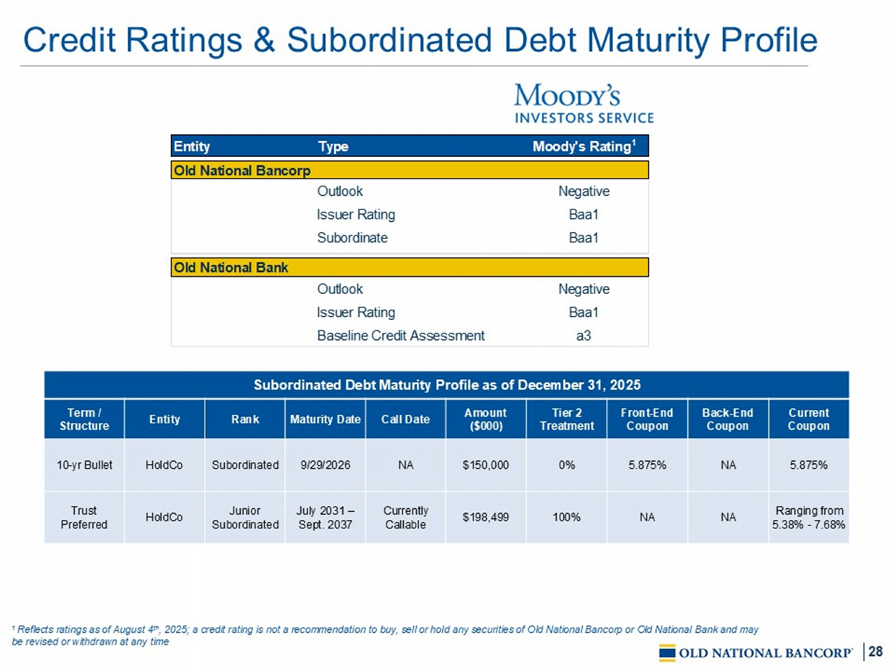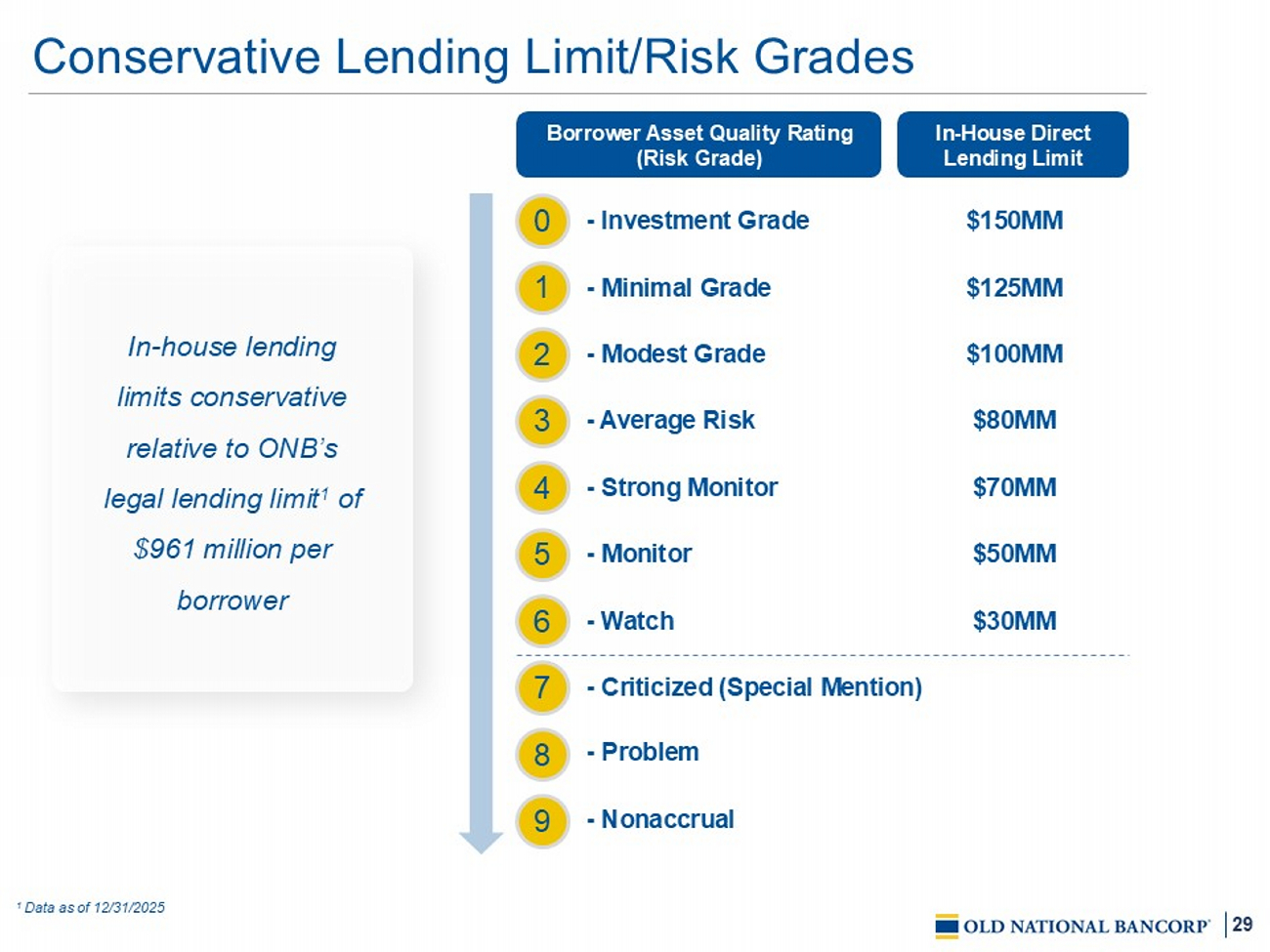 28 Credit Ratings & Subordinated Debt Maturity Profile Subordinated Debt Maturity Profile as of December 31, 2025 Current Coupon Back - End Coupon Front - End Coupon Tier 2 Treatment Amount ($000) Call Date Maturity Date Rank Entity Term / Structure 5.875% NA 5.875% 0% $150,000 NA 9/29/2026 Subordinated HoldCo 10 - yr Bullet Ranging from 5.38% - 7.68% NA NA 100% $198,499 Currently Callable July 2031 – Sept. 2037 Junior Subordinated HoldCo Trust Preferred Entity Type Moody's Rating 1 Old National Bancorp Outlook Negative Issuer Rating Baa1 Subordinate Baa1 Old National Bank Outlook Negative Issuer Rating Baa1 Baseline Credit Assessment a3 1 Reflects ratings as of August 4 th , 2025; a credit rating is not a recommendation to buy, sell or hold any securities of Old National Bancorp or Old National B ank and may be revised or withdrawn at any time