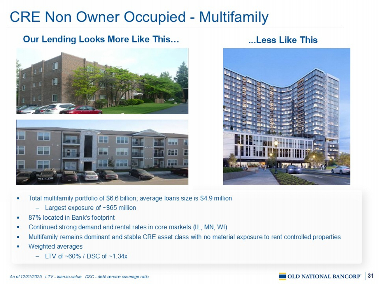 30 CRE Non Owner Occupied - Office Our Lending Looks More Like This … ...Less Like This ▪ Total office portfolio of $ 2.0 billion; average loan size is $3. 5 million – Largest exposure of ~$ 7 0 million (large, diversified MOB) ▪ 86 % located in B ank’s footprint, diversified by submarket ▪ 4 7 % of portfolio is MOB and/or occupied by investment grade tenants ▪ CBD office exposure is moderate (1 4 % of NOO Office) and primarily within footprint, across 12 cities ▪ Weighted averages – LTV of ~6 1 % – DSC of ~1.5 3 x As of 12 /3 1 /2025 CBD - Central business district NOO - Non - owner occupied LTV - loan - to - value DSC - debt service coverage ratio MOB – medical office building