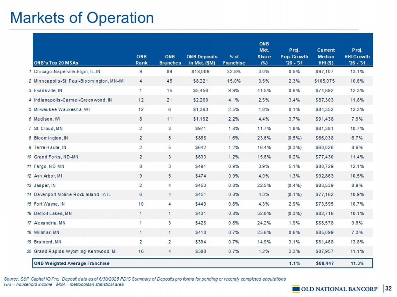 32 Markets of Operation ONB's Top 20 MSAs ONB Rank ONB Branches ONB Deposits in Mkt. ($M) % of Franchise ONB Mkt. Share (%) Proj. Pop. Growth '26 - '31 Current Median HHI ($) Proj. HHI Growth '26 - '31 1 Chicago-Naperville-Elgin, IL-IN 9 89 $18,009 32.8% 3.0% 0.5% $97,107 13.1% 2 Minneapolis-St. Paul-Bloomington, MN-WI 4 45 $8,221 15.0% 3.5% 2.3% $105,075 10.6% 3 Evansville, IN 1 15 $5,456 9.9% 41.5% 0.6% $74,892 12.3% 4 Indianapolis-Carmel-Greenwood, IN 12 21 $2,269 4.1% 2.5% 3.4% $87,303 11.8% 5 Milwaukee-Waukesha, WI 12 6 $1,363 2.5% 1.8% 0.1% $84,352 12.3% 6 Madison, WI 8 11 $1,192 2.2% 4.4% 3.7% $91,438 7.9% 7 St. Cloud, MN 2 3 $971 1.8% 11.7% 1.8% $81,381 10.7% 8 Bloomington, IN 2 5 $868 1.6% 23.6% (0.5%) $66,038 6.7% 9 Terre Haute, IN 2 5 $642 1.2% 16.4% (0.3%) $60,026 8.6% 10 Grand Forks, ND-MN 2 3 $633 1.2% 15.6% 0.2% $77,430 11.4% 11 Fargo, ND-MN 8 3 $491 0.9% 3.9% 5.1% $80,729 12.1% 12 Ann Arbor, MI 9 5 $474 0.9% 4.0% 1.3% $92,863 10.5% 13 Jasper, IN 2 4 $453 0.8% 22.5% (0.4%) $83,539 8.9% 14 Davenport-Moline-Rock Island, IA-IL 6 4 $451 0.8% 4.3% (0.1%) $77,162 10.9% 15 Fort Wayne, IN 10 4 $449 0.8% 4.3% 2.9% $73,595 10.7% 16 Detroit Lakes, MN 1 1 $431 0.8% 32.0% (0.3%) $82,716 10.1% 17 Alexandria, MN 1 3 $428 0.8% 24.2% 1.9% $88,578 9.6% 18 Willmar, MN 1 1 $410 0.7% 23.6% 0.6% $85,099 7.3% 19 Brainerd, MN 2 2 $394 0.7% 14.9% 3.1% $81,468 13.8% 20 Grand Rapids-Wyoming-Kentwood, MI 16 4 $388 0.7% 1.2% 2.3% $87,957 11.1% ONB Weighted Average Franchise 1.1% $88,447 11.3% Source: S&P Capital IQ Pro ; Deposit d ata as of 6/30/2025 FDIC Summary of Deposits pro forma for pending or recently completed acquisitions HHI – household income MSA - metropolitan statistical area