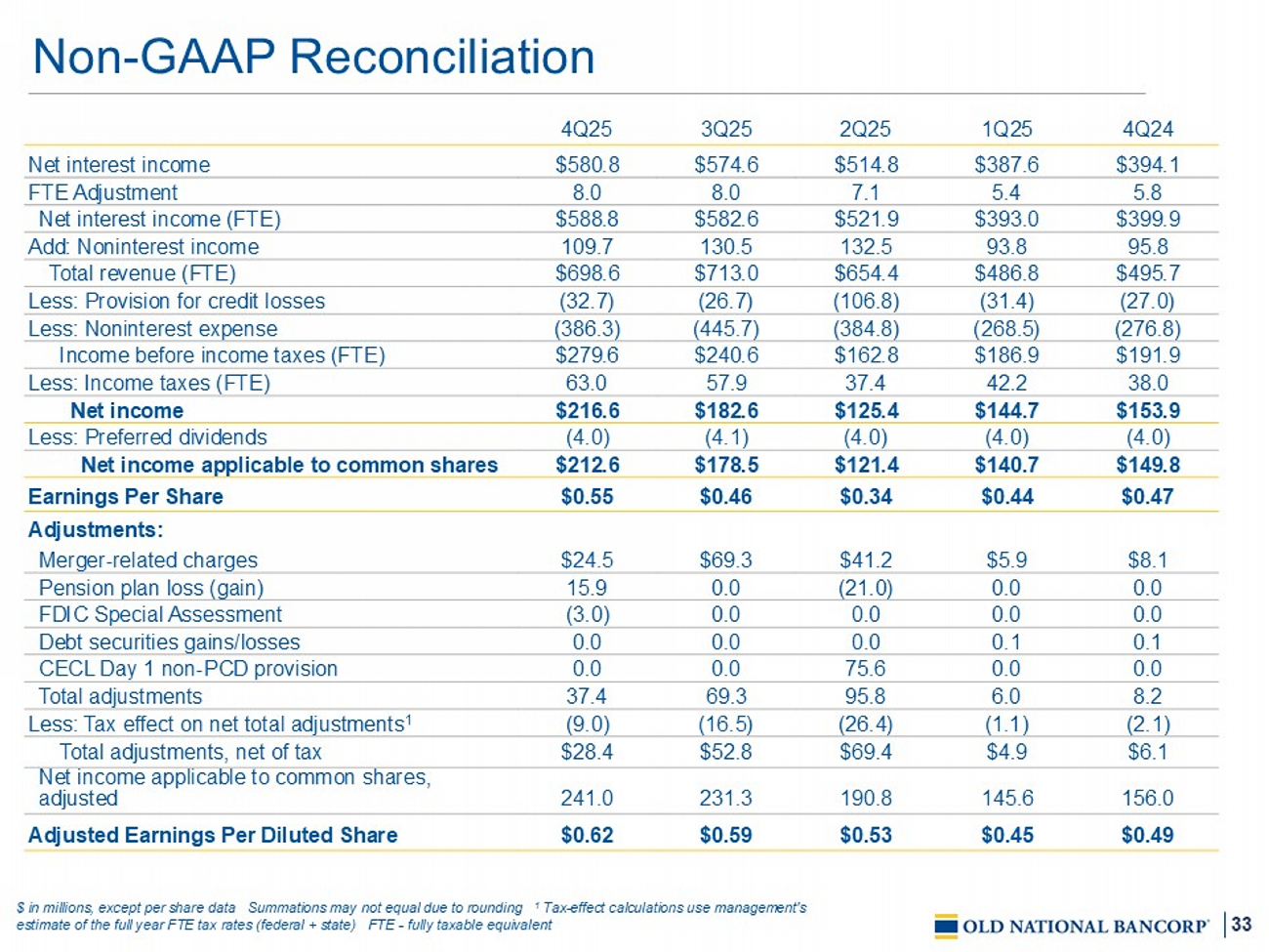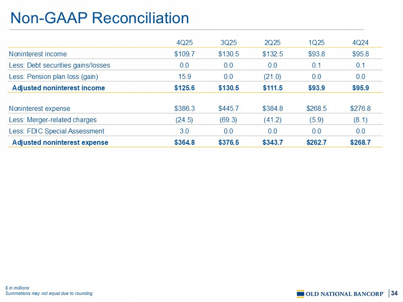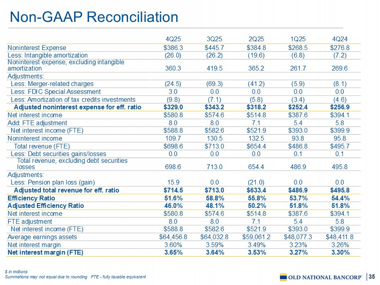 33 4Q24 1 Q2 5 2Q25 3Q25 4Q25 $394. 1 $ 387.6 $514.8 $574.6 $580.8 Net interest income 5.8 5.4 7.1 8.0 8.0 FTE Adjustment $ 399 . 9 $ 393.0 $521.9 $582.6 $588. 8 Net interest income (FTE) 95.8 93.8 132.5 130.5 109.7 Add: Noninterest income $495.7 $ 486.8 $654.4 $713.0 $698.6 Total revenue (FTE) (27.0) ( 31.4 ) (106.8) (26.7) (32. 7 ) Less: Provision for credit losses (276.8) ( 268.5 ) (384.8) (445.7) (386.3) Less: Noninterest expense $191.9 $ 186.9 $162.8 $240.6 $279. 6 Income before income taxes (FTE) 38.0 42.2 37.4 57.9 63.0 Less: Income taxes (FTE) $153.9 $ 144.7 $125.4 $182.6 $216.6 Net income (4.0) (4.0) (4.0) (4.1) (4.0) Less: Preferred dividends $149.8 $ 140.7 $121.4 $178.5 $212.6 Net income applicable to common shares $0.47 $0. 44 $0.34 $0.46 $0.55 Earnings Per Share Adjustments: $8.1 $ 5.9 $41.2 $69.3 $24.5 Merger - related charges 0.0 0.0 (21.0) 0.0 15.9 Pension plan loss (gain) 0.0 0.0 0.0 0.0 (3.0) FDIC Special Assessment 0.1 0. 1 0.0 0.0 0.0 Debt securities gains/losses 0.0 0.0 75.6 0.0 0.0 CECL Day 1 non - PCD provision 8.2 6.0 95.8 69.3 37.4 Total adjustments (2.1) ( 1.1 ) (26.4) (16.5) (9.0) Less: Tax effect on net total adjustments 1 $6.1 $ 4.9 $69.4 $52.8 $28.4 Total adjustments, net of tax 156.0 145.6 190.8 231.3 241.0 Net income applicable to common shares, adjusted $0.49 $0. 45 $0.53 $0.59 $0.62 Adjusted Earnings Per Diluted Share Non - GAAP Reconciliation $ in millions, except per share data Summations may not equal due to rounding 1 Tax - effect calculations use management's estimate of the full year FTE tax rates (federal + state) FTE - f ully taxable equivalent
