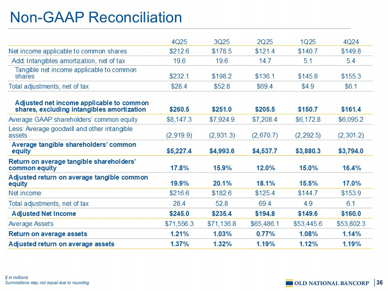 35 Non - GAAP Reconciliation $ in millions Summations may not equal due to rounding FTE - f ully taxable equivalent 4Q24 1 Q25 2 Q25 3Q25 4Q25 $276.8 $ 268.5 $ 384.8 $445.7 $386.3 Noninterest Expense (7.2) ( 6.8 ) ( 19.6 ) (26.2) (26.0) Less: Intangible amortization 269.6 261.7 365.2 419.5 360.3 Noninterest expense, excluding intangible amortization Adjustments: (8.1) ( 5.9 ) ( 41.2 ) (69.3) (24.5) Less: Merger - related charges 0.0 0.0 0.0 0.0 3.0 Less: FDIC Special Assessment (4.6) ( 3.4 ) ( 5.8 ) (7.1) (9.8) Less: Amortization of tax credits investments $256.9 $ 252.4 $ 318.2 $343.2 $329.0 Adjusted noninterest expense for eff. ratio $394.1 $ 387.6 $ 514.8 $574.6 $580.8 Net interest income 5.8 5.4 7.1 8.0 8.0 Add: FTE adjustment $399.9 $ 393.0 $ 521.9 $582.6 $588. 8 Net interest income (FTE) 95.8 93.8 132.5 130.5 109.7 Noninterest income $495.7 $ 486.8 $ 654.4 $713.0 $698.6 Total revenue (FTE) 0.1 0. 1 0.0 0.0 0.0 Less: Debt securities gains/losses 495.8 486.9 654.4 713.0 698.6 Total revenue, excluding debt securities losses Adjustments: 0.0 0.0 (21.0) 0.0 15.9 Less: Pension plan loss (gain) $495.8 $ 486.9 $ 633.4 $713.0 $714.5 Adjusted total revenue for eff. ratio 54.4% 53.7 % 55.8 % 58.8% 51.6% Efficiency Ratio 51.8% 51.8 % 50.2 % 48.1% 46.0% Adjusted Efficiency Ratio $394.1 $ 387.6 $ 514.8 $574.6 $580.8 Net interest income 5.8 5.4 7.1 8.0 8.0 FTE adjustment $399.9 $ 393.0 $ 521.9 $582.6 $588.8 Net interest income (FTE) $48,411.8 $ 48,077.3 $ 59,061.2 $64,032.8 $64,456.8 Average earnings assets 3.26% 3. 23 % 3. 4 9% 3.59% 3.60% Net interest margin 3.30% 3. 27 % 3. 53 % 3.64% 3.65% Net interest margin (FTE)