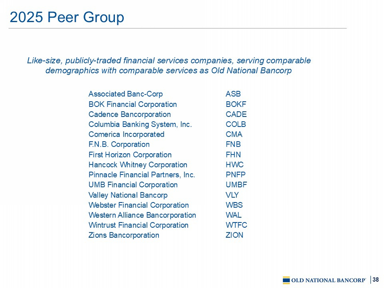 38 2025 Peer Group Like - size, publicly - traded financial services companies, serving comparable demographics with comparable services as Old National Bancorp ASB Associated Banc - Corp BOKF BOK Financial Corporation CADE Cadence Bancorporation COLB Columbia Banking System, Inc. CMA Comerica Incorporated FNB F.N.B. Corporation FHN First Horizon Corporation HWC Hancock Whitney Corporation PNFP Pinnacle Financial Partners, Inc. UMBF UMB Financial Corporation VLY Valley National Bancorp WBS Webster Financial Corporation WAL Western Alliance Bancorporation WTFC Wintrust Financial Corporation ZION Zions Bancorporation