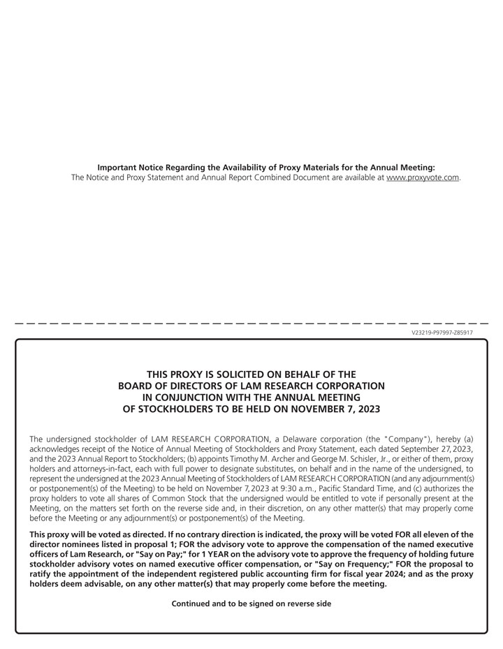 We cordially invite you to attend the Lam Research Corporation 2023 Annual Meeting of Stockholders. The annual meeting will be held on Tuesday, November 7, 2023, at 9:30 a.m. Pacific Standard Time. This year’s annual meeting will be a virtual meeting. You may attend the annual meeting, vote, and submit your questions during the live webcast of the annual meeting by visiting virtualshareholdermeeting.com/LRCX2023 and entering the 16-digit control number included in our Notice of Internet Availability or on your proxy card.