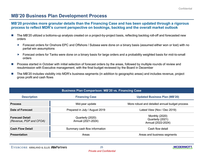 Confidential Fundamental Operating Assumptions (continued) n In contrast to the current business plan, the base Financing Case assumed: n Stability in the supply chain, with no adverse impact from vendors on operations n No sale of Tech and loss of pull-through n No change to strategic framework relative to LNG and Power Comparison to n No consideration of a potential Chapter 11 filing Financing Case n No management and employee distractions due to distress from current situation n Continued support from the customer base, with sustained new orders n MB‘20 for 2020 and 2021 is broadly in line with Chapter 11 scenarios which were prepared and shared as part of the Strategic Alternatives presentation on November 11, 2019 n Underlying cash flow requirements based on the business plan with no further adjustments to business assumptions n Incorporates estimated administrative costs associated with Chapter 11 process n Vendor assumptions include no impairment of trade, First Day Order relief of ~$900 million and no DIP contraction in trade terms Assumptions n L/C (including bi-lats) and surety requirements : n All L/Cs for new projects assumed to be placed on the DIP as well as all renewals of secured L/Cs n Assumes continued renewals of expiring bilateral L/Cs n Assumes continued renewals of expiring surety bonds n Business plan assumes 100% of Tech is sold and no benefit from a commercial arrangement with the Pull Through buyer Assumptions n All orders related to pull through have been removed from the business plan 24 Private and ConfidentialConfidential Fundamental Operating Assumptions (continued) n In contrast to the current business plan, the base Financing Case assumed: n Stability in the supply chain, with no adverse impact from vendors on operations n No sale of Tech and loss of pull-through n No change to strategic framework relative to LNG and Power Comparison to n No consideration of a potential Chapter 11 filing Financing Case n No management and employee distractions due to distress from current situation n Continued support from the customer base, with sustained new orders n MB‘20 for 2020 and 2021 is broadly in line with Chapter 11 scenarios which were prepared and shared as part of the Strategic Alternatives presentation on November 11, 2019 n Underlying cash flow requirements based on the business plan with no further adjustments to business assumptions n Incorporates estimated administrative costs associated with Chapter 11 process n Vendor assumptions include no impairment of trade, First Day Order relief of ~$900 million and no DIP contraction in trade terms Assumptions n L/C (including bi-lats) and surety requirements : n All L/Cs for new projects assumed to be placed on the DIP as well as all renewals of secured L/Cs n Assumes continued renewals of expiring bilateral L/Cs n Assumes continued renewals of expiring surety bonds n Business plan assumes 100% of Tech is sold and no benefit from a commercial arrangement with the Pull Through buyer Assumptions n All orders related to pull through have been removed from the business plan 24 Private and Confidential