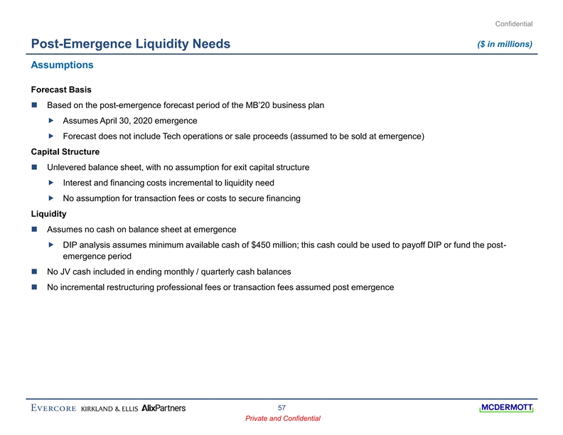 Confidential ($ in millions) Post-Emergence Liquidity Needs Assumptions Forecast Basis n Based on the post-emergence forecast period of the MB’20 business plan „ Assumes April 30, 2020 emergence „ Forecast does not include Tech operations or sale proceeds (assumed to be sold at emergence) Capital Structure n Unlevered balance sheet, with no assumption for exit capital structure „ Interest and financing costs incremental to liquidity need „ No assumption for transaction fees or costs to secure financing Liquidity n Assumes no cash on balance sheet at emergence „ DIP analysis assumes minimum available cash of $450 million; this cash could be used to payoff DIP or fund the post- emergence period n No JV cash included in ending monthly / quarterly cash balances n No incremental restructuring professional fees or transaction fees assumed post emergence 57 Private and ConfidentialConfidential ($ in millions) Post-Emergence Liquidity Needs Assumptions Forecast Basis n Based on the post-emergence forecast period of the MB’20 business plan „ Assumes April 30, 2020 emergence „ Forecast does not include Tech operations or sale proceeds (assumed to be sold at emergence) Capital Structure n Unlevered balance sheet, with no assumption for exit capital structure „ Interest and financing costs incremental to liquidity need „ No assumption for transaction fees or costs to secure financing Liquidity n Assumes no cash on balance sheet at emergence „ DIP analysis assumes minimum available cash of $450 million; this cash could be used to payoff DIP or fund the post- emergence period n No JV cash included in ending monthly / quarterly cash balances n No incremental restructuring professional fees or transaction fees assumed post emergence 57 Private and Confidential
