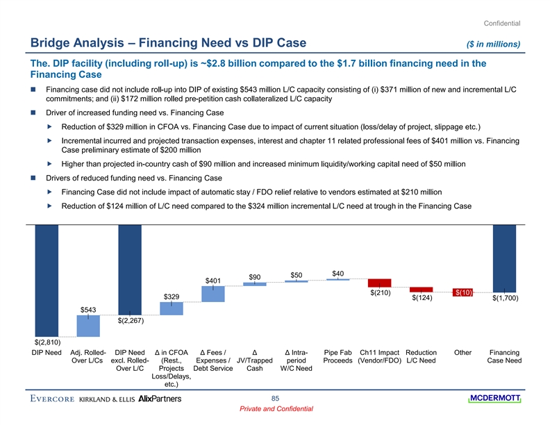 Confidential Bridge Analysis – Financing Need vs DIP Case ($ in millions) The. DIP facility (including roll-up) is ~$2.8 billion compared to the $1.7 billion financing need in the Financing Case n Financing case did not include roll-up into DIP of existing $543 million L/C capacity consisting of (i) $371 million of new and incremental L/C commitments; and (ii) $172 million rolled pre-petition cash collateralized L/C capacity n Driver of increased funding need vs. Financing Case „ Reduction of $329 million in CFOA vs. Financing Case due to impact of current situation (loss/delay of project, slippage etc.) „ Incremental incurred and projected transaction expenses, interest and chapter 11 related professional fees of $401 million vs. Financing Case preliminary estimate of $200 million „ Higher than projected in-country cash of $90 million and increased minimum liquidity/working capital need of $50 million n Drivers of reduced funding need vs. Financing Case „ Financing Case did not include impact of automatic stay / FDO relief relative to vendors estimated at $210 million „ Reduction of $124 million of L/C need compared to the $324 million incremental L/C need at trough in the Financing Case $40 $50 $90 $401 $(210) $(10) $329 $(124) $(1,700) $543 $(2,267) $(2,810) DIP Need Adj. Rolled- DIP Need Δ in CFOA Δ Fees / Δ Δ Intra- Pipe Fab Ch11 Impact Reduction Other Financing Over L/Cs excl. Rolled- (Rest., Expenses / JV/Trapped period Proceeds (Vendor/FDO) L/C Need Case Need Over L/C Projects Debt Service Cash W/C Need Loss/Delays, etc.) 85 Private and ConfidentialConfidential Bridge Analysis – Financing Need vs DIP Case ($ in millions) The. DIP facility (including roll-up) is ~$2.8 billion compared to the $1.7 billion financing need in the Financing Case n Financing case did not include roll-up into DIP of existing $543 million L/C capacity consisting of (i) $371 million of new and incremental L/C commitments; and (ii) $172 million rolled pre-petition cash collateralized L/C capacity n Driver of increased funding need vs. Financing Case „ Reduction of $329 million in CFOA vs. Financing Case due to impact of current situation (loss/delay of project, slippage etc.) „ Incremental incurred and projected transaction expenses, interest and chapter 11 related professional fees of $401 million vs. Financing Case preliminary estimate of $200 million „ Higher than projected in-country cash of $90 million and increased minimum liquidity/working capital need of $50 million n Drivers of reduced funding need vs. Financing Case „ Financing Case did not include impact of automatic stay / FDO relief relative to vendors estimated at $210 million „ Reduction of $124 million of L/C need compared to the $324 million incremental L/C need at trough in the Financing Case $40 $50 $90 $401 $(210) $(10) $329 $(124) $(1,700) $543 $(2,267) $(2,810) DIP Need Adj. Rolled- DIP Need Δ in CFOA Δ Fees / Δ Δ Intra- Pipe Fab Ch11 Impact Reduction Other Financing Over L/Cs excl. Rolled- (Rest., Expenses / JV/Trapped period Proceeds (Vendor/FDO) L/C Need Case Need Over L/C Projects Debt Service Cash W/C Need Loss/Delays, etc.) 85 Private and Confidential