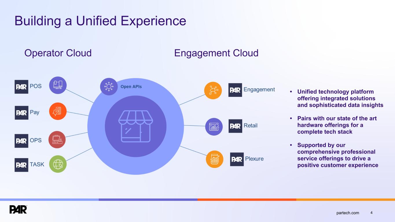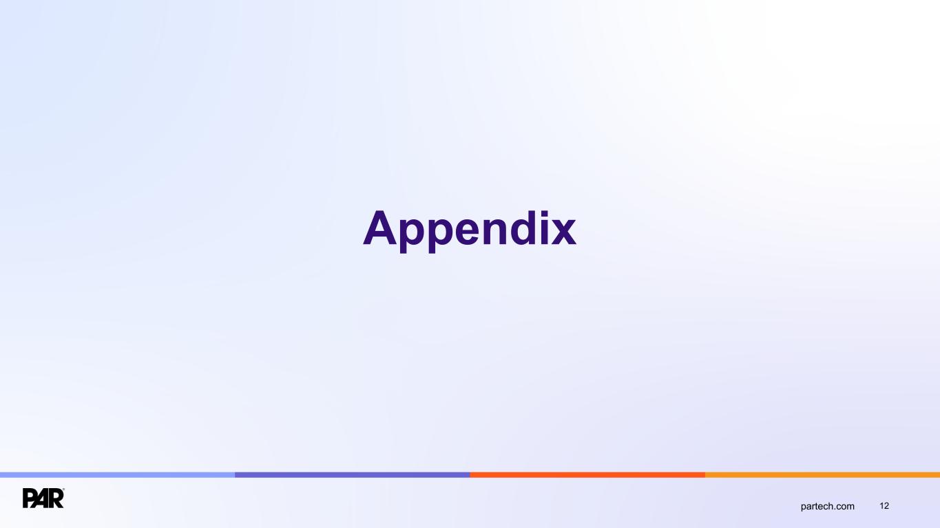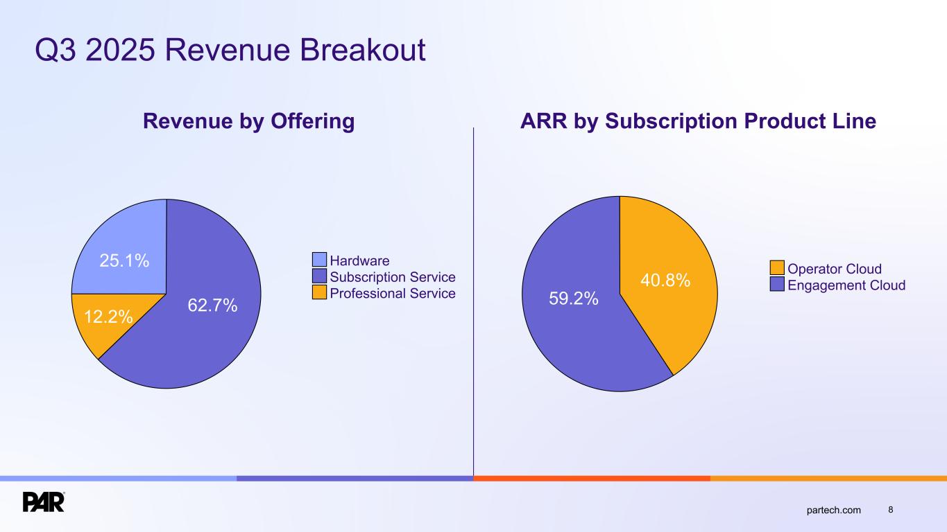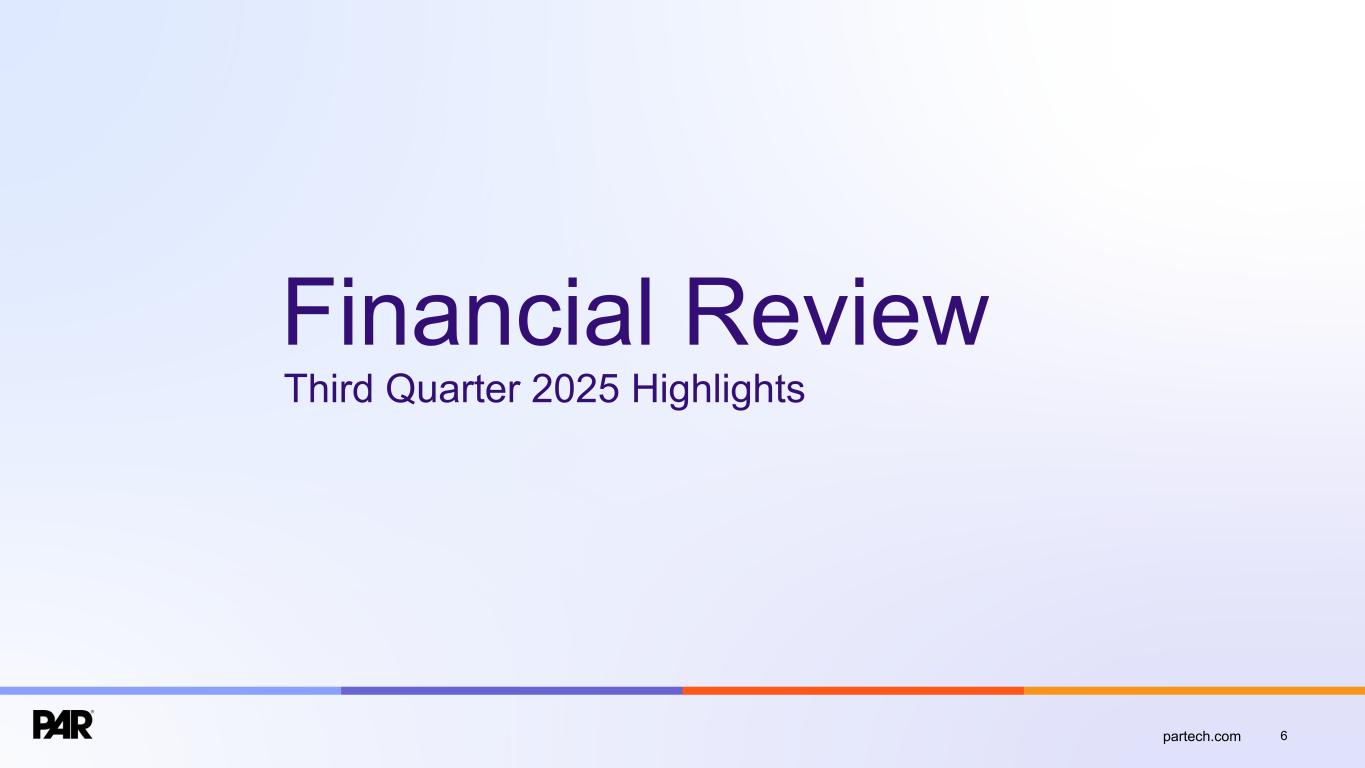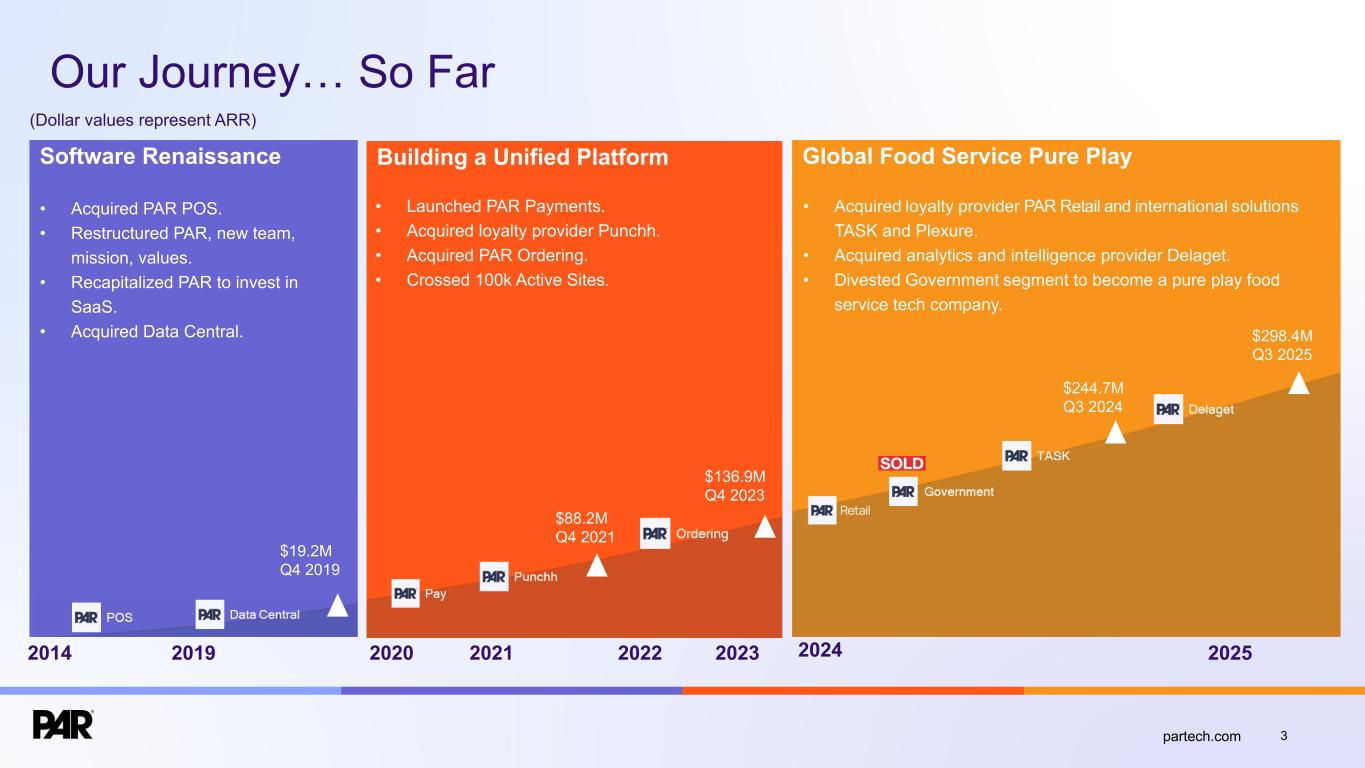 Forward-Looking Statements. This presentation contains forward-looking statements made pursuant to the safe harbor provisions of Section 21E of the Securities Exchange Act of 1934, as amended, Section 27A of the Securities Act of 1933, as amended, and the Private Securities Litigation Reform Act of 1995, and the accuracy of such statements is necessarily subject to risks, uncertainties and assumptions as to future events that may not prove to be accurate. Forward-looking statements can be identified by words such as “believe,” “could,” “would,” “should,” “will,” “continue,” “anticipate,” “expect,” “path,” “plan,” “intend,” “estimate,” “future,” “may,” “potential,” and similar expressions.These statements include, but are not limited to, express or implied forward-looking statements relating to: the plans, strategies and objectives of management relating to our growth, results of operations, and financial performance, including service and product offerings, the development, demand, market share, and competitive performance of our products and services; revenues, gross margin percentage, expenses, cash flows, and other financial measures and key performance indicators, including ARR, Active Sites, subscription service gross margins, net loss, and net loss per share; the availability and terms of product and component supplies for our hardware products; anticipated benefits of acquisitions, divestitures, and capital markets transactions; and macroeconomic trends, geopolitical events, tariffs, and trade disputes and the expected impact of those trends and events on our business, results of operations, and financial performance. These statements are neither promises nor guarantees but are subject to a variety of risks and uncertainties, many of which are beyond our control, which could cause actual results to differ materially from those contemplated in these forward-looking statements. Factors, risks, trends and uncertainties that could cause actual results to differ materially from those expressed or implied by forward-looking statements include our ability to successfully develop or acquire and transition new products and services and enhance existing products and services to meet evolving customer needs and respond to emerging technological trends, including our effective us of artificial intelligence (AI) in product development and integration of AI tools into our product and service offerings; our ability to add and retain Active Sites and integration partners; our ability to successfully integrate acquisitions into our operations, and realize the anticipated benefits; macroeconomic trends, such as a recession or slowed economic growth, fluctuating interest rates, inflation, and changes in consumer confidence and discretionary spending; geopolitical events affecting countries where we operate or our customers or suppliers operate, including changes in import/export regulations, such as tariffs, and trade disputes involving the United States and those countries; our ability to retain and manage suppliers, secure alternative suppliers, and manage inventory levels and costs, navigate manufacturing disruptions or logistics challenges, shipping delays, and shipping costs; and the other factors discussed in our most recent Annual Report on Form 10-K and our other filings with the Securities and Exchange Commission. Undue reliance should not be placed on the forward-looking statements in this presentation, which are based on information available to us on the date hereof. We undertake no obligation to update or revise any forward-looking statements, whether as a result of new information, future events, or otherwise, except as may be required under applicable securities law. Industry and Market Data. Market, industry, and other data included in this presentation are from or based on our own internal good faith estimates and research, and on publicly available publications, research, surveys and studies conducted by third parties, which we believe are reliable, but have not independently verified. Similarly, while we believe our internal estimates and research are reliable, we have not independently verified our internal estimates or research. While we are not aware of any misstatements regarding any market, industry, or other data used by us or expressed in this presentation, such information, because it has not been verified or, by its nature - market surveys, estimates, projections or similar data, are inherently subject to uncertainties, and actual results may differ materially from the assumptions and circumstances reflected in this information. Key Performance Indicators and Non-GAAP Financial Measures.(1) We monitor certain key performance indicators and non-GAAP financial measures in the evaluation and management of our business; certain key performance indicators and non-GAAP financial measures are provided in this presentation as we believe they are useful in facilitating period-to-period comparisons of our business performance. Key performance indicators and non-GAAP financial measures do not reflect and should be viewed independently of our financial performance determined in accordance with GAAP. Key performance indicators and non-GAAP financial measures are not forecasts or indicators of future or expected results and should not have undue reliance placed upon them by investors. Where non-GAAP financial measures are included in this presentation, the most directly comparable GAAP financial measures and a detailed reconciliation between GAAP and non-GAAP financial measures is included in the Appendix to this presentation. Unless otherwise indicated, financial and operating data included in this presentation is as of September 30, 2025. Trademarks. “PAR®,” “PAR POS®”, “Punchh®,” “PAR OrderingTM”, "PAR OPSTM," “Data Central®," “DelagetTM,” "PAR RetailTM", "PAR® Pay”, “PAR® Payment Services”