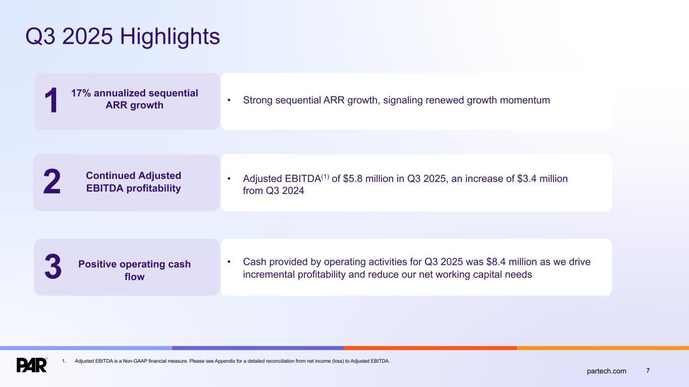 7partech.com Q3 2025 Highlights 2 3 Positive operating cash flow • Cash provided by operating activities for Q3 2025 was $8.4 million as we drive incremental profitability and reduce our net working capital needs • Strong sequential ARR growth, signaling renewed growth momentum Continued Adjusted EBITDA profitability • Adjusted EBITDA(1) of $5.8 million in Q3 2025, an increase of $3.4 million from Q3 2024 17% annualized sequential ARR growth1 1. Adjusted EBITDA is a Non-GAAP financial measure. Please see Appendix for a detailed reconciliation from net income (loss) to Adjusted EBITDA.