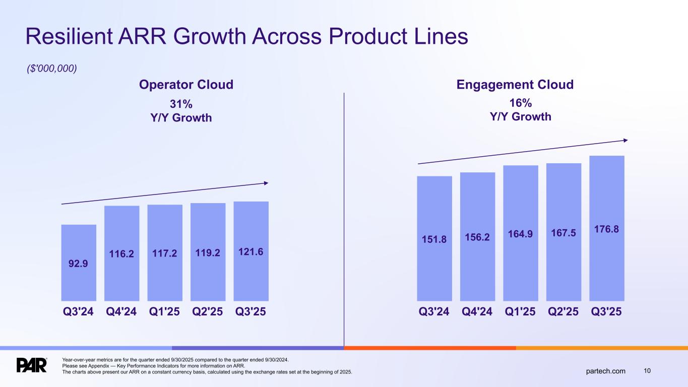 10partech.com 16% Y/Y Growth 92.9 116.2 117.2 119.2 121.6 Q3'24 Q4'24 Q1'25 Q2'25 Q3'25 ($'000,000) Operator Cloud 31% Y/Y Growth 151.8 156.2 164.9 167.5 176.8 Q3'24 Q4'24 Q1'25 Q2'25 Q3'25 Engagement Cloud Resilient ARR Growth Across Product Lines Year-over-year metrics are for the quarter ended 9/30/2025 compared to the quarter ended 9/30/2024. Please see Appendix — Key Performance Indicators for more information on ARR. The charts above present our ARR on a constant currency basis, calculated using the exchange rates set at the beginning of 2025.