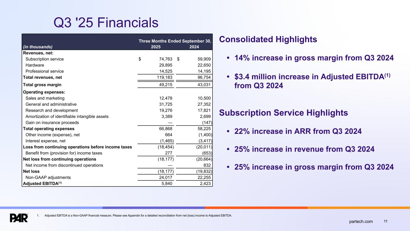 11partech.com Q3 '25 Financials Consolidated Highlights • 14% increase in gross margin from Q3 2024 • $3.4 million increase in Adjusted EBITDA(1) from Q3 2024 Subscription Service Highlights • 22% increase in ARR from Q3 2024 • 25% increase in revenue from Q3 2024 • 25% increase in gross margin from Q3 2024 Three Months Ended September 30, (in thousands) 2025 2024 Revenues, net: Subscription service $ 74,763 $ 59,909 Hardware 29,895 22,650 Professional service 14,525 14,195 Total revenues, net 119,183 96,754 Total gross margin 49,215 43,031 Operating expenses: Sales and marketing 12,478 10,500 General and administrative 31,725 27,352 Research and development 19,276 17,821 Amortization of identifiable intangible assets 3,389 2,699 Gain on insurance proceeds — (147) Total operating expenses 66,868 58,225 Other income (expense), net 664 (1,400) Interest expense, net (1,465) (3,417) Loss from continuing operations before income taxes (18,454) (20,011) Benefit from (provision for) income taxes 277 (653) Net loss from continuing operations (18,177) (20,664) Net income from discontinued operations — 832 Net loss (18,177) (19,832) Non-GAAP adjustments 24,017 22,255 Adjusted EBITDA(1) 5,840 2,423 1. Adjusted EBITDA is a Non-GAAP financial measure. Please see Appendix for a detailed reconciliation from net (loss) income to Adjusted EBITDA.