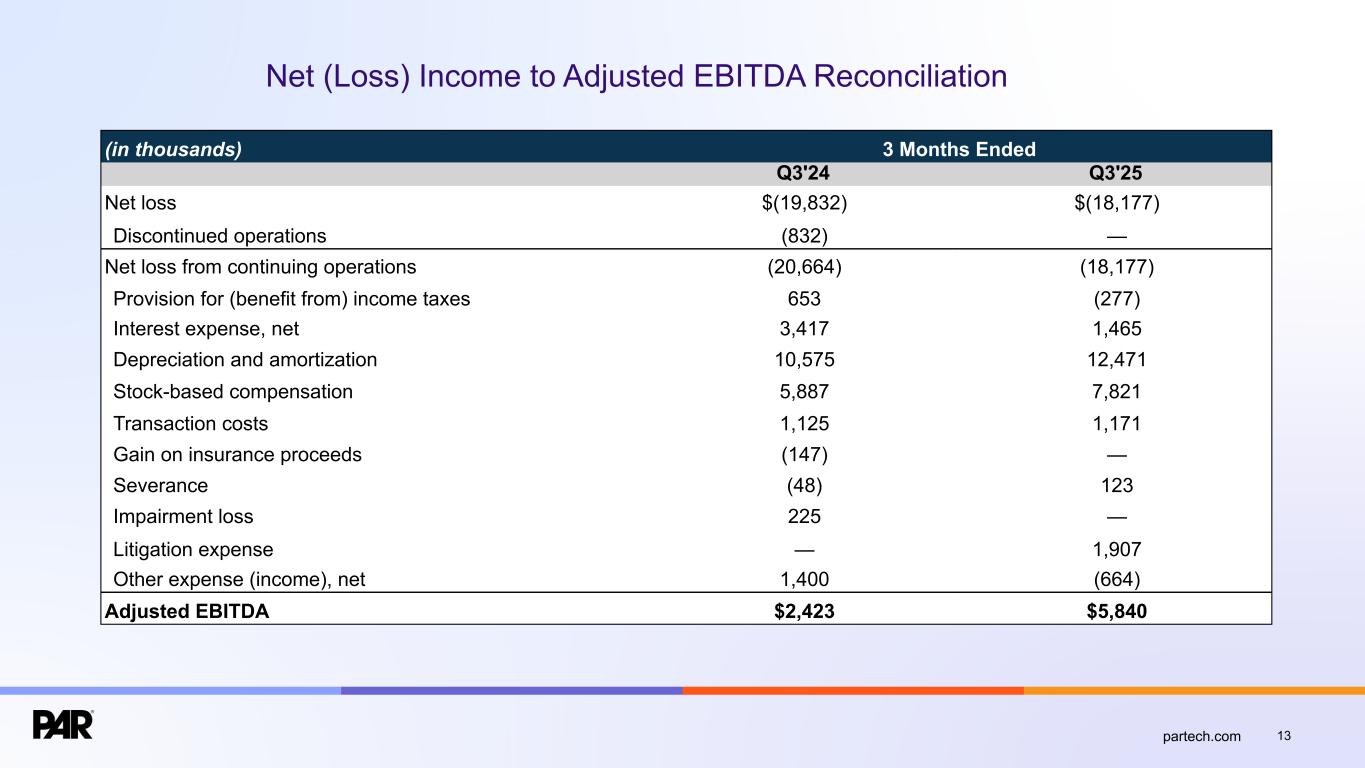 13partech.com (in thousands) 3 Months Ended Q3'24 Q3'25 Net loss $(19,832) $(18,177) Discontinued operations (832) — Net loss from continuing operations (20,664) (18,177) Provision for (benefit from) income taxes 653 (277) Interest expense, net 3,417 1,465 Depreciation and amortization 10,575 12,471 Stock-based compensation 5,887 7,821 Transaction costs 1,125 1,171 Gain on insurance proceeds (147) — Severance (48) 123 Impairment loss 225 — Litigation expense — 1,907 Other expense (income), net 1,400 (664) Adjusted EBITDA $2,423 $5,840 Net (Loss) Income to Adjusted EBITDA Reconciliation