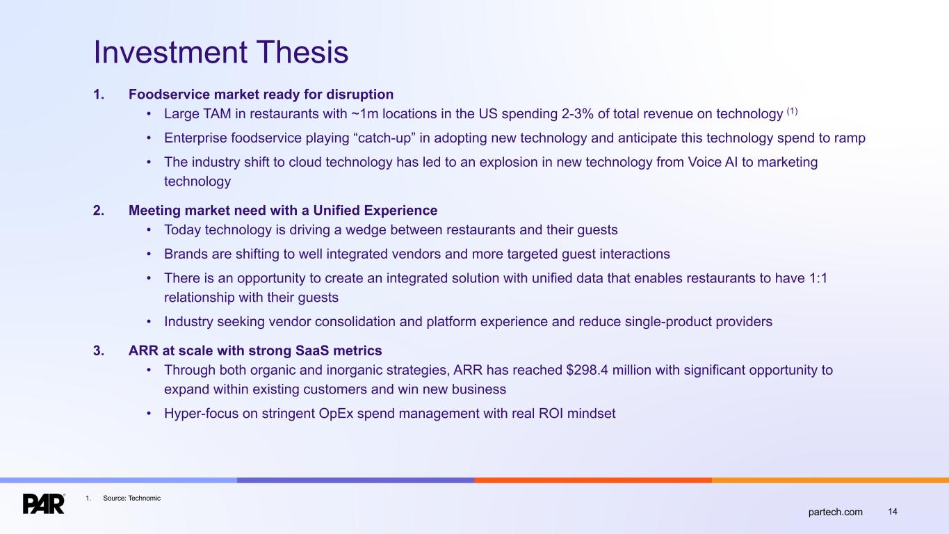14partech.com Investment Thesis 1. Foodservice market ready for disruption • Large TAM in restaurants with ~1m locations in the US spending 2-3% of total revenue on technology (1) • Enterprise foodservice playing “catch-up” in adopting new technology and anticipate this technology spend to ramp • The industry shift to cloud technology has led to an explosion in new technology from Voice AI to marketing technology 2. Meeting market need with a Unified Experience • Today technology is driving a wedge between restaurants and their guests • Brands are shifting to well integrated vendors and more targeted guest interactions • There is an opportunity to create an integrated solution with unified data that enables restaurants to have 1:1 relationship with their guests • Industry seeking vendor consolidation and platform experience and reduce single-product providers 3. ARR at scale with strong SaaS metrics • Through both organic and inorganic strategies, ARR has reached $298.4 million with significant opportunity to expand within existing customers and win new business • Hyper-focus on stringent OpEx spend management with real ROI mindset 1. Source: Technomic