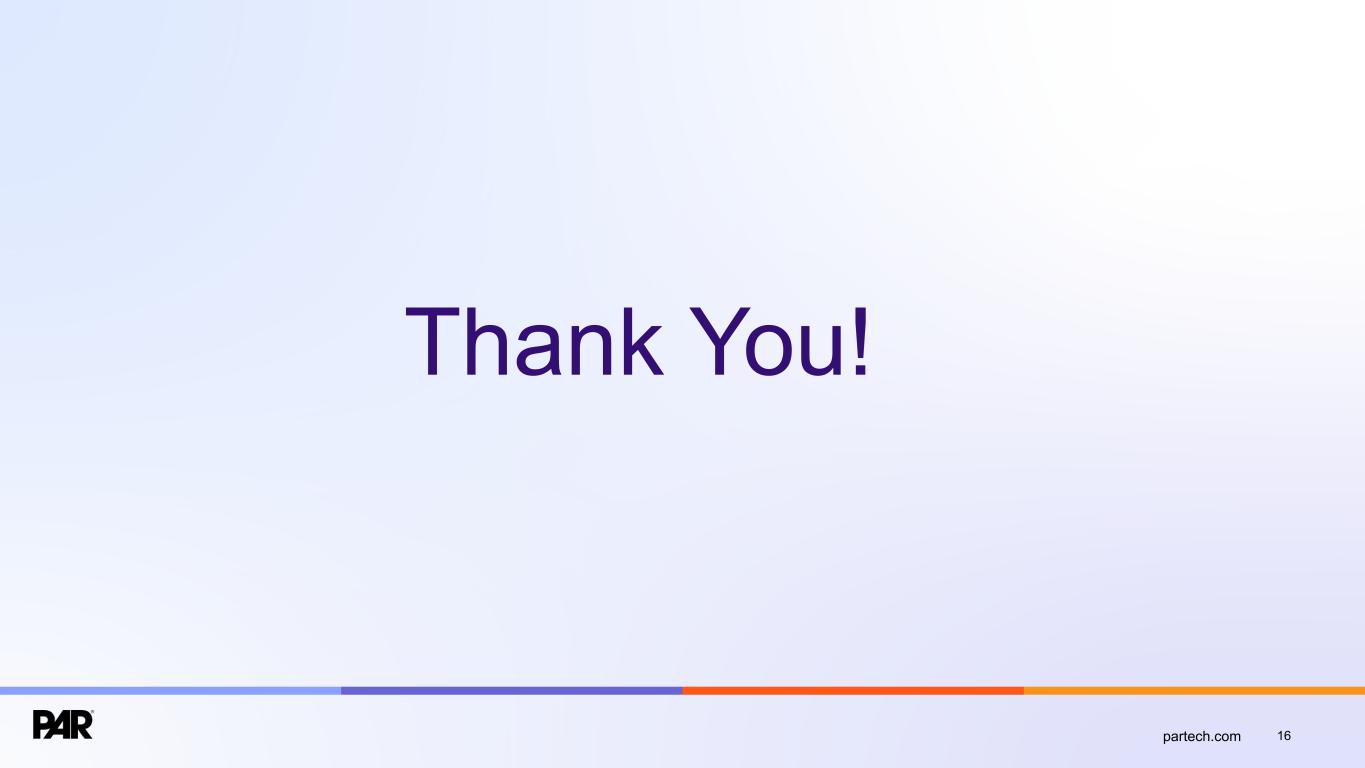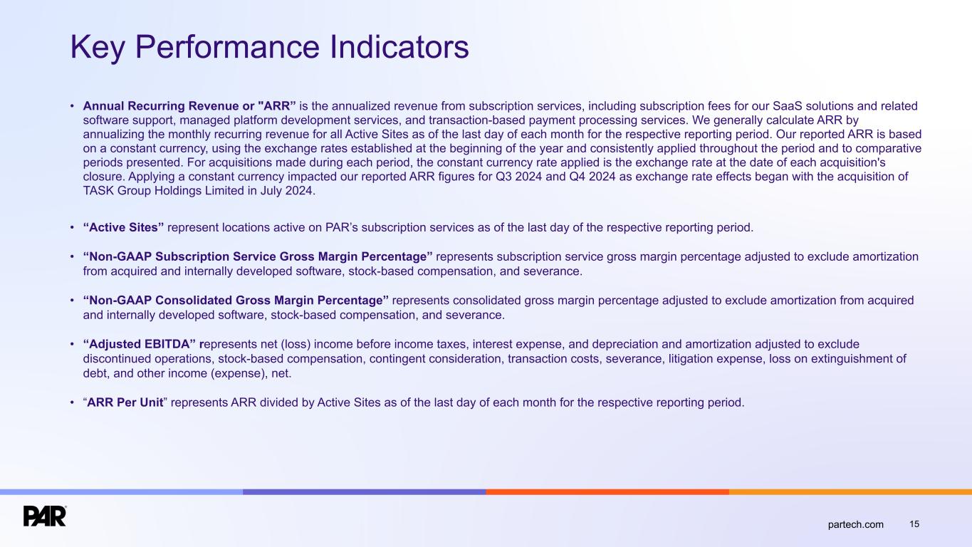 15partech.com Key Performance Indicators • Annual Recurring Revenue or "ARR” is the annualized revenue from subscription services, including subscription fees for our SaaS solutions and related software support, managed platform development services, and transaction-based payment processing services. We generally calculate ARR by annualizing the monthly recurring revenue for all Active Sites as of the last day of each month for the respective reporting period. Our reported ARR is based on a constant currency, using the exchange rates established at the beginning of the year and consistently applied throughout the period and to comparative periods presented. For acquisitions made during each period, the constant currency rate applied is the exchange rate at the date of each acquisition's closure. Applying a constant currency impacted our reported ARR figures for Q3 2024 and Q4 2024 as exchange rate effects began with the acquisition of TASK Group Holdings Limited in July 2024. • “Active Sites” represent locations active on PAR’s subscription services as of the last day of the respective reporting period. • “Non-GAAP Subscription Service Gross Margin Percentage” represents subscription service gross margin percentage adjusted to exclude amortization from acquired and internally developed software, stock-based compensation, and severance. • “Non-GAAP Consolidated Gross Margin Percentage” represents consolidated gross margin percentage adjusted to exclude amortization from acquired and internally developed software, stock-based compensation, and severance. • “Adjusted EBITDA” represents net (loss) income before income taxes, interest expense, and depreciation and amortization adjusted to exclude discontinued operations, stock-based compensation, contingent consideration, transaction costs, severance, litigation expense, loss on extinguishment of debt, and other income (expense), net. • “ARR Per Unit” represents ARR divided by Active Sites as of the last day of each month for the respective reporting period.