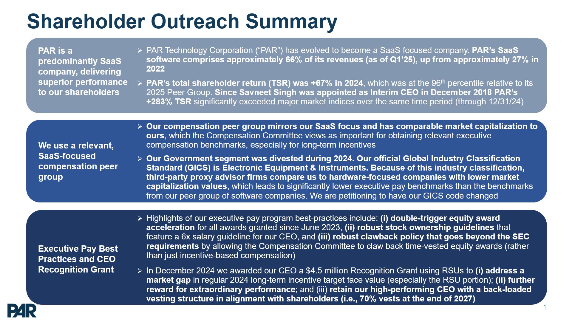 Shareholder Outreach Summary 1 PAR is a predominantly SaaS company,