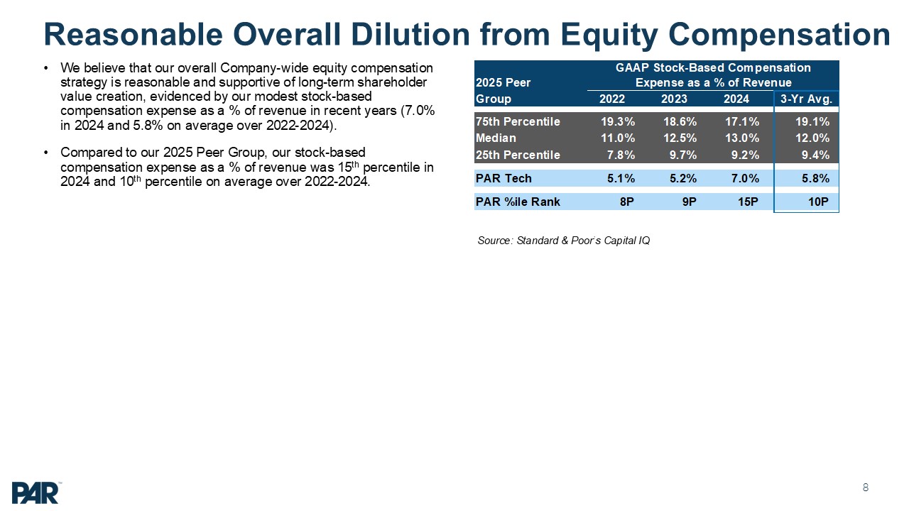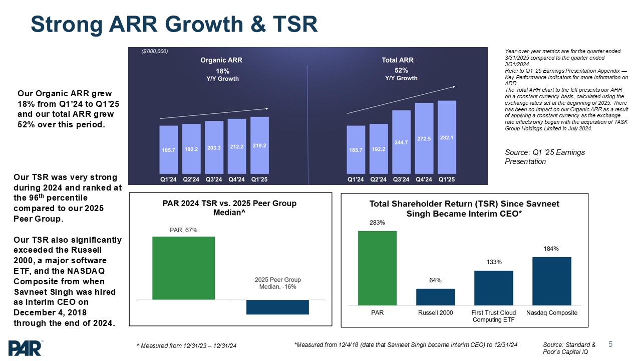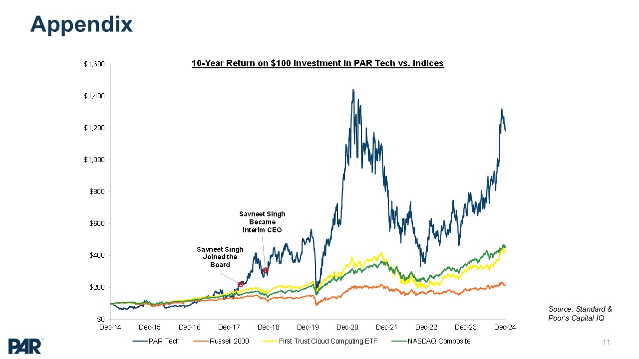 shareholder return (TSR) was +67% in 2024, which was at the 96th percentile relative to its 2025 Peer Group. Since Savneet Singh was appointed as Interim CEO in December 2018 PAR’s +283% TSR significantly exceeded major market indices over
