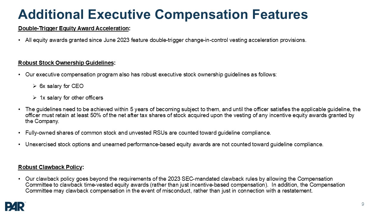 double-trigger equity award acceleration for all awards granted since June 2023, (ii) robust stock ownership guidelines that feature a 6x salary guideline for our CEO, and (iii) robust clawback policy that goes beyond the SEC requirements
