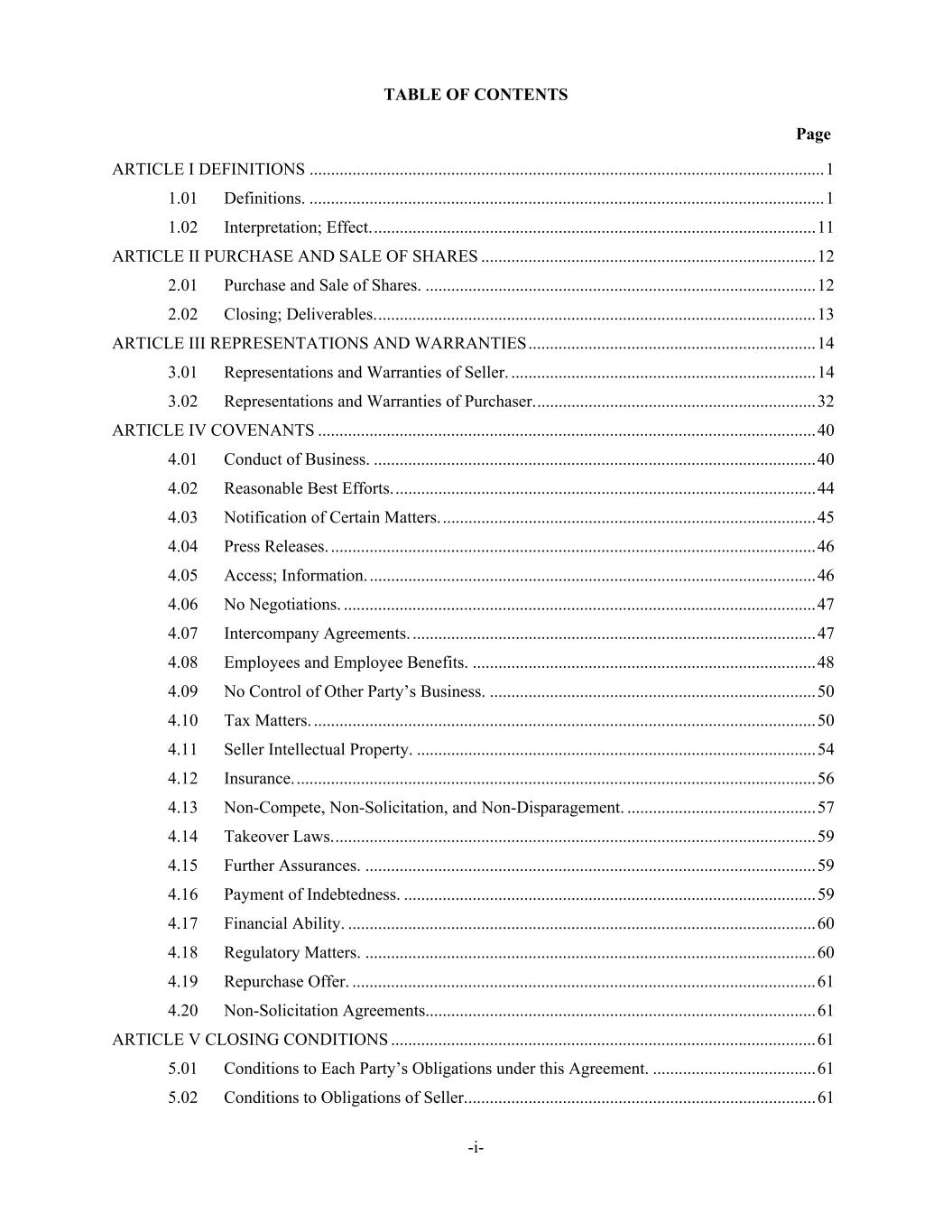 TABLE OF CONTENTS Page -i- ARTICLE I DEFINITIONS ........................................................................................................................ 1 1.01 Definitions. ........................................................................................................................ 1 1.02 Interpretation; Effect. ....................................................................................................... 11 ARTICLE II PURCHASE AND SALE OF SHARES .............................................................................. 12 2.01 Purchase and Sale of Shares. ........................................................................................... 12 2.02 Closing; Deliverables. ...................................................................................................... 13 ARTICLE III REPRESENTATIONS AND WARRANTIES ................................................................... 14 3.01 Representations and Warranties of Seller. ....................................................................... 14 3.02 Representations and Warranties of Purchaser. ................................................................. 32 ARTICLE IV COVENANTS .................................................................................................................... 40 4.01 Conduct of Business. ....................................................................................................... 40 4.02 Reasonable Best Efforts. .................................................................................................. 44 4.03 Notification of Certain Matters. ....................................................................................... 45 4.04 Press Releases. ................................................................................................................. 46 4.05 Access; Information. ........................................................................................................ 46 4.06 No Negotiations. .............................................................................................................. 47 4.07 Intercompany Agreements. .............................................................................................. 47 4.08 Employees and Employee Benefits. ................................................................................ 48 4.09 No Control of Other Party’s Business. ............................................................................ 50 4.10 Tax Matters. ..................................................................................................................... 50 4.11 Seller Intellectual Property. ............................................................................................. 54 4.12 Insurance. ......................................................................................................................... 56 4.13 Non-Compete, Non-Solicitation, and Non-Disparagement. ............................................ 57 4.14 Takeover Laws. ................................................................................................................ 59 4.15 Further Assurances. ......................................................................................................... 59 4.16 Payment of Indebtedness. ................................................................................................ 59 4.17 Financial Ability. ............................................................................................................. 60 4.18 Regulatory Matters. ......................................................................................................... 60 4.19 Repurchase Offer. ............................................................................................................ 61 4.20 Non-Solicitation Agreements........................................................................................... 61 ARTICLE V CLOSING CONDITIONS ................................................................................................... 61 5.01 Conditions to Each Party’s Obligations under this Agreement. ...................................... 61 5.02 Conditions to Obligations of Seller. ................................................................................. 61