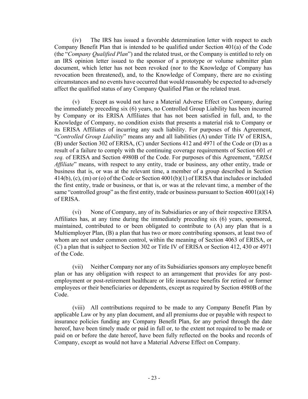 - 23 - (iv) The IRS has issued a favorable determination letter with respect to each Company Benefit Plan that is intended to be qualified under Section 401(a) of the Code (the “Company Qualified Plan”) and the related trust, or the Company is entitled to rely on an IRS opinion letter issued to the sponsor of a prototype or volume submitter plan document, which letter has not been revoked (nor to the Knowledge of Company has revocation been threatened), and, to the Knowledge of Company, there are no existing circumstances and no events have occurred that would reasonably be expected to adversely affect the qualified status of any Company Qualified Plan or the related trust. (v) Except as would not have a Material Adverse Effect on Company, during the immediately preceding six (6) years, no Controlled Group Liability has been incurred by Company or its ERISA Affiliates that has not been satisfied in full, and, to the Knowledge of Company, no condition exists that presents a material risk to Company or its ERISA Affiliates of incurring any such liability. For purposes of this Agreement, “Controlled Group Liability” means any and all liabilities (A) under Title IV of ERISA, (B) under Section 302 of ERISA, (C) under Sections 412 and 4971 of the Code or (D) as a result of a failure to comply with the continuing coverage requirements of Section 601 et seq. of ERISA and Section 4980B of the Code. For purposes of this Agreement, “ERISA Affiliate” means, with respect to any entity, trade or business, any other entity, trade or business that is, or was at the relevant time, a member of a group described in Section 414(b), (c), (m) or (o) of the Code or Section 4001(b)(1) of ERISA that includes or included the first entity, trade or business, or that is, or was at the relevant time, a member of the same “controlled group” as the first entity, trade or business pursuant to Section 4001(a)(14) of ERISA. (vi) None of Company, any of its Subsidiaries or any of their respective ERISA Affiliates has, at any time during the immediately preceding six (6) years, sponsored, maintained, contributed to or been obligated to contribute to (A) any plan that is a Multiemployer Plan, (B) a plan that has two or more contributing sponsors, at least two of whom are not under common control, within the meaning of Section 4063 of ERISA, or (C) a plan that is subject to Section 302 or Title IV of ERISA or Section 412, 430 or 4971 of the Code. (vii) Neither Company nor any of its Subsidiaries sponsors any employee benefit plan or has any obligation with respect to an arrangement that provides for any post- employment or post-retirement healthcare or life insurance benefits for retired or former employees or their beneficiaries or dependents, except as required by Section 4980B of the Code. (viii) All contributions required to be made to any Company Benefit Plan by applicable Law or by any plan document, and all premiums due or payable with respect to insurance policies funding any Company Benefit Plan, for any period through the date hereof, have been timely made or paid in full or, to the extent not required to be made or paid on or before the date hereof, have been fully reflected on the books and records of Company, except as would not have a Material Adverse Effect on Company.