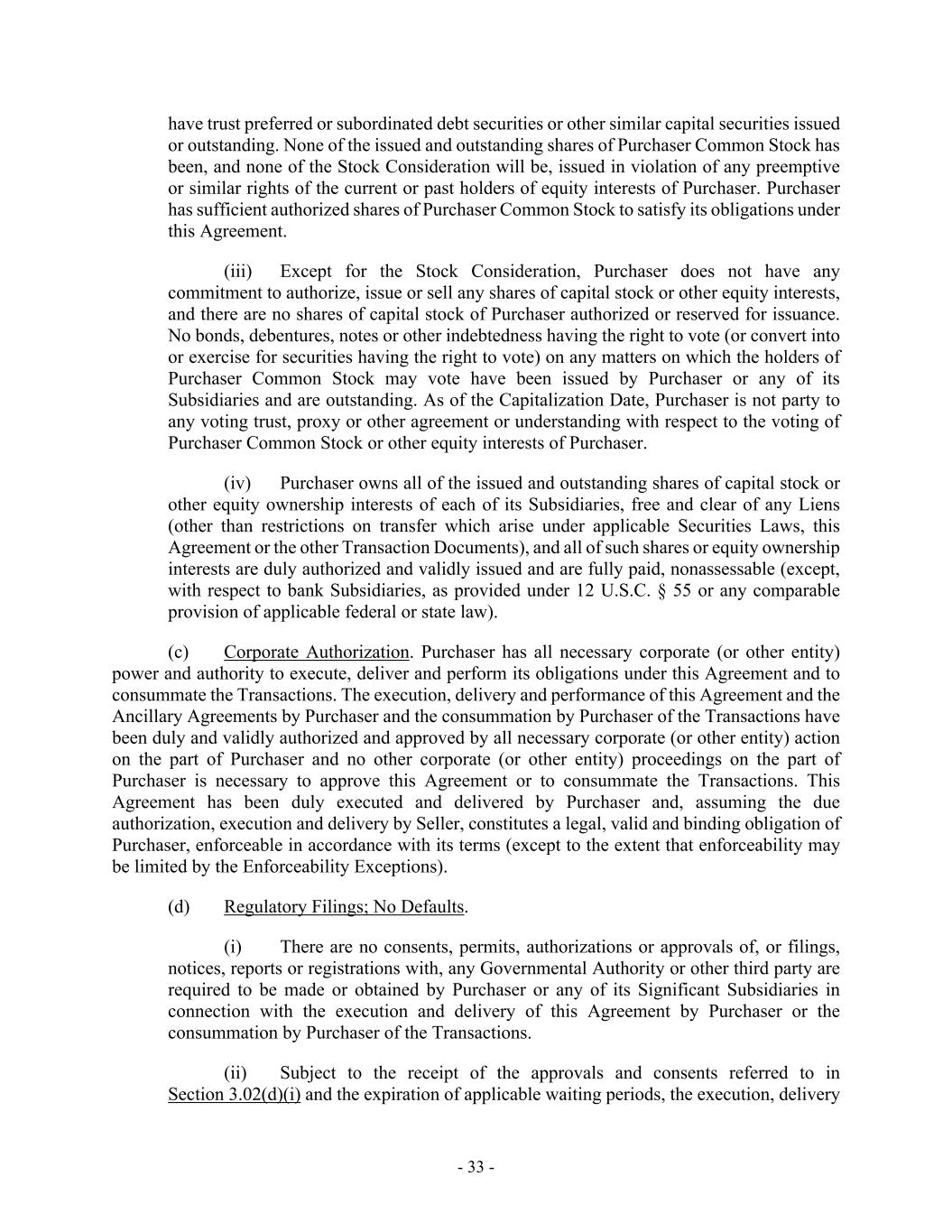 - 33 - have trust preferred or subordinated debt securities or other similar capital securities issued or outstanding. None of the issued and outstanding shares of Purchaser Common Stock has been, and none of the Stock Consideration will be, issued in violation of any preemptive or similar rights of the current or past holders of equity interests of Purchaser. Purchaser has sufficient authorized shares of Purchaser Common Stock to satisfy its obligations under this Agreement. (iii) Except for the Stock Consideration, Purchaser does not have any commitment to authorize, issue or sell any shares of capital stock or other equity interests, and there are no shares of capital stock of Purchaser authorized or reserved for issuance. No bonds, debentures, notes or other indebtedness having the right to vote (or convert into or exercise for securities having the right to vote) on any matters on which the holders of Purchaser Common Stock may vote have been issued by Purchaser or any of its Subsidiaries and are outstanding. As of the Capitalization Date, Purchaser is not party to any voting trust, proxy or other agreement or understanding with respect to the voting of Purchaser Common Stock or other equity interests of Purchaser. (iv) Purchaser owns all of the issued and outstanding shares of capital stock or other equity ownership interests of each of its Subsidiaries, free and clear of any Liens (other than restrictions on transfer which arise under applicable Securities Laws, this Agreement or the other Transaction Documents), and all of such shares or equity ownership interests are duly authorized and validly issued and are fully paid, nonassessable (except, with respect to bank Subsidiaries, as provided under 12 U.S.C. § 55 or any comparable provision of applicable federal or state law). (c) Corporate Authorization. Purchaser has all necessary corporate (or other entity) power and authority to execute, deliver and perform its obligations under this Agreement and to consummate the Transactions. The execution, delivery and performance of this Agreement and the Ancillary Agreements by Purchaser and the consummation by Purchaser of the Transactions have been duly and validly authorized and approved by all necessary corporate (or other entity) action on the part of Purchaser and no other corporate (or other entity) proceedings on the part of Purchaser is necessary to approve this Agreement or to consummate the Transactions. This Agreement has been duly executed and delivered by Purchaser and, assuming the due authorization, execution and delivery by Seller, constitutes a legal, valid and binding obligation of Purchaser, enforceable in accordance with its terms (except to the extent that enforceability may be limited by the Enforceability Exceptions). (d) Regulatory Filings; No Defaults. (i) There are no consents, permits, authorizations or approvals of, or filings, notices, reports or registrations with, any Governmental Authority or other third party are required to be made or obtained by Purchaser or any of its Significant Subsidiaries in connection with the execution and delivery of this Agreement by Purchaser or the consummation by Purchaser of the Transactions. (ii) Subject to the receipt of the approvals and consents referred to in Section 3.02(d)(i) and the expiration of applicable waiting periods, the execution, delivery