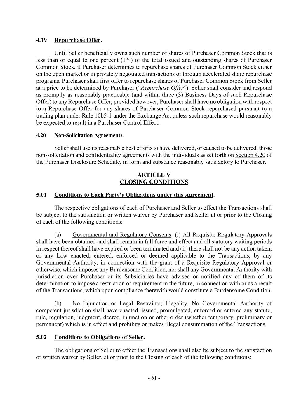 - 61 - 4.19 Repurchase Offer. Until Seller beneficially owns such number of shares of Purchaser Common Stock that is less than or equal to one percent (1%) of the total issued and outstanding shares of Purchaser Common Stock, if Purchaser determines to repurchase shares of Purchaser Common Stock either on the open market or in privately negotiated transactions or through accelerated share repurchase programs, Purchaser shall first offer to repurchase shares of Purchaser Common Stock from Seller at a price to be determined by Purchaser (“Repurchase Offer”). Seller shall consider and respond as promptly as reasonably practicable (and within three (3) Business Days of such Repurchase Offer) to any Repurchase Offer; provided however, Purchaser shall have no obligation with respect to a Repurchase Offer for any shares of Purchaser Common Stock repurchased pursuant to a trading plan under Rule 10b5-1 under the Exchange Act unless such repurchase would reasonably be expected to result in a Purchaser Control Effect. 4.20 Non-Solicitation Agreements. Seller shall use its reasonable best efforts to have delivered, or caused to be delivered, those non-solicitation and confidentiality agreements with the individuals as set forth on Section 4.20 of the Purchaser Disclosure Schedule, in form and substance reasonably satisfactory to Purchaser. ARTICLE V CLOSING CONDITIONS 5.01 Conditions to Each Party’s Obligations under this Agreement. The respective obligations of each of Purchaser and Seller to effect the Transactions shall be subject to the satisfaction or written waiver by Purchaser and Seller at or prior to the Closing of each of the following conditions: (a) Governmental and Regulatory Consents. (i) All Requisite Regulatory Approvals shall have been obtained and shall remain in full force and effect and all statutory waiting periods in respect thereof shall have expired or been terminated and (ii) there shall not be any action taken, or any Law enacted, entered, enforced or deemed applicable to the Transactions, by any Governmental Authority, in connection with the grant of a Requisite Regulatory Approval or otherwise, which imposes any Burdensome Condition, nor shall any Governmental Authority with jurisdiction over Purchaser or its Subsidiaries have advised or notified any of them of its determination to impose a restriction or requirement in the future, in connection with or as a result of the Transactions, which upon compliance therewith would constitute a Burdensome Condition. (b) No Injunction or Legal Restraints; Illegality. No Governmental Authority of competent jurisdiction shall have enacted, issued, promulgated, enforced or entered any statute, rule, regulation, judgment, decree, injunction or other order (whether temporary, preliminary or permanent) which is in effect and prohibits or makes illegal consummation of the Transactions. 5.02 Conditions to Obligations of Seller. The obligations of Seller to effect the Transactions shall also be subject to the satisfaction or written waiver by Seller, at or prior to the Closing of each of the following conditions: