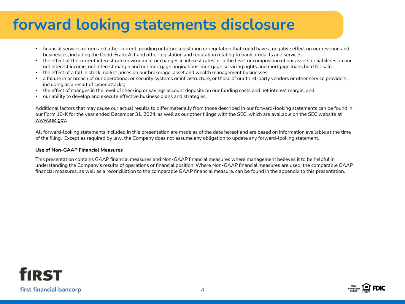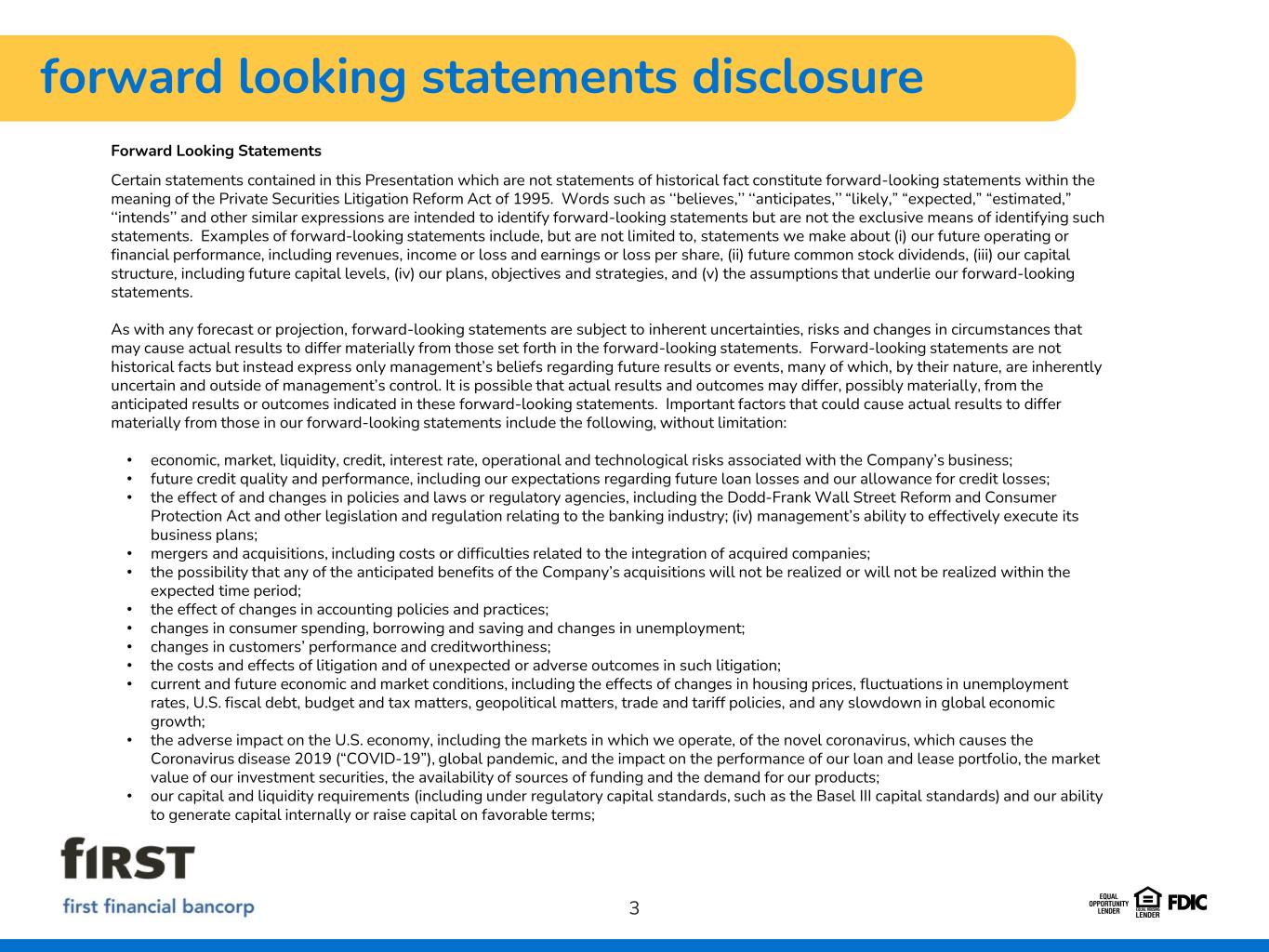 disclaimer 2 This Presentation contains summarized consolidated information concerning First Financial Bancorp. (the “Company”) and the Company’s business, operations, financial performance and trends. No representation is made that the information in this presentation is complete. For additional financial, statistical and business-related information, see the Company’s most recent Annual Report on Form 10-K filed with the U.S. Securities and Exchange Commission (the “SEC”) for the fiscal year ended December 31, 2024 and Quarterly Reports on Form 10-Q filed with the SEC for the quarters ended March 31, 2025, June 30, 2025 and September 30, 2025, as well as the Company's other reports filed with the SEC from time to time. Such reports are or will be available in the Investor Relations section of the Company’s website (www.bankatfirst.com) and the SEC’s website (https://www.sec.gov).