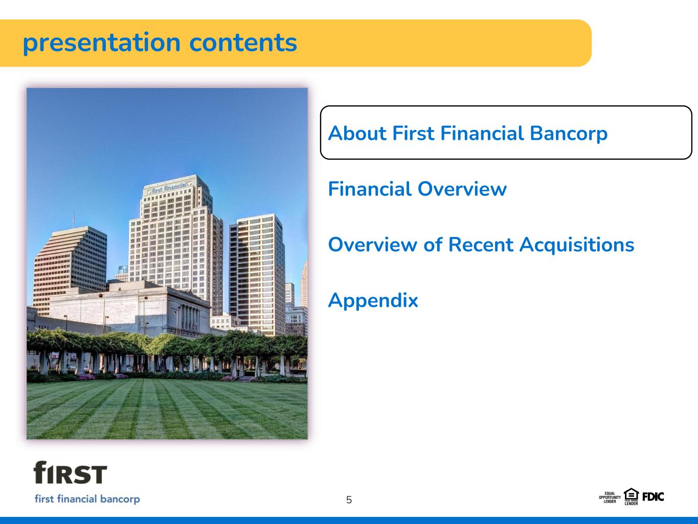 About First Financial Bancorp Financial Overview Overview of Recent Acquisitions Appendix presentation contents 5