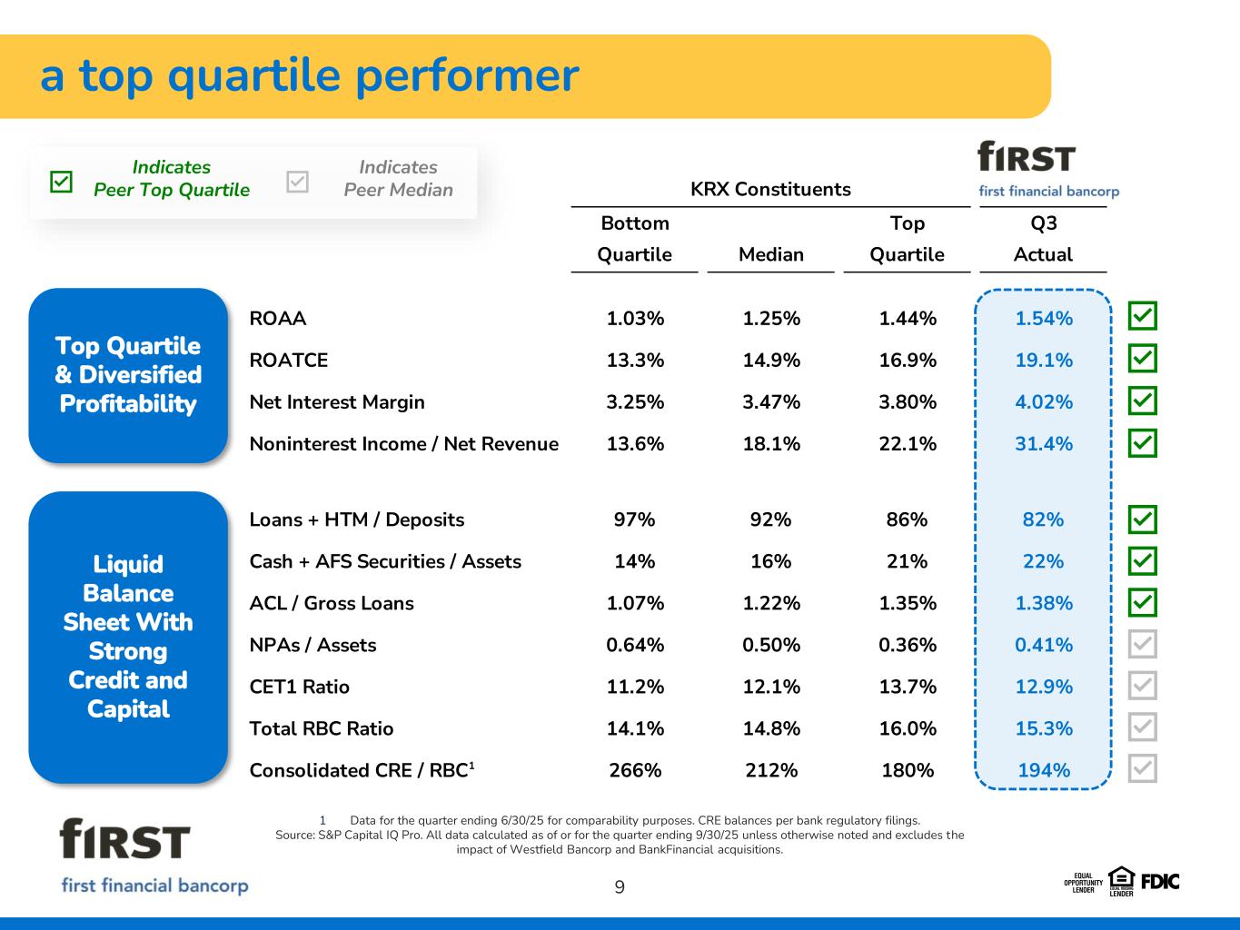 a long history of growth 8 $18.6B $6.4B $7.2B $8.1B $8.4B $8.9B $14.0B $14.5B $16.0B $16.3B $17.0B $17.5B $18.6B $22.1B 2013 2014 2015 2016 2017 2018 2019 2020 2021 2022 2023 2024 Q3'25 Total Assets ($B) 2014 First Financial acquires Insight Bank, First Bexley Bank and The Guernsey Bank (Combined assets of ~$700M) (Banks – OH) 2015 First Financial acquires Oak Street Funding (Specialty Lender) 2018 First Financial acquires MainSource Financial Group (Total assets of ~$4.6B) (Bank – IN) 2019 First Financial acquires Bannockburn Global Forex (Foreign Exchange) 2021 First Financial acquires Summit Funding Group (Equipment Finance) 2024 First Financial acquires Agile Premium Finance (Specialty Lender) 2025 First Financial announces acquisitions of Westfield Bancorp and BankFinancial (Combined assets of ~$3.5B) (Banks – OH/IL) 6 4 Bank Acquisitions Non-Bank Acquisitions 1 1 Excludes purchase accounting or other balance sheet adjustments. Note: Excludes ~$4 million acquisition of Brady Ware Capital in 2023.