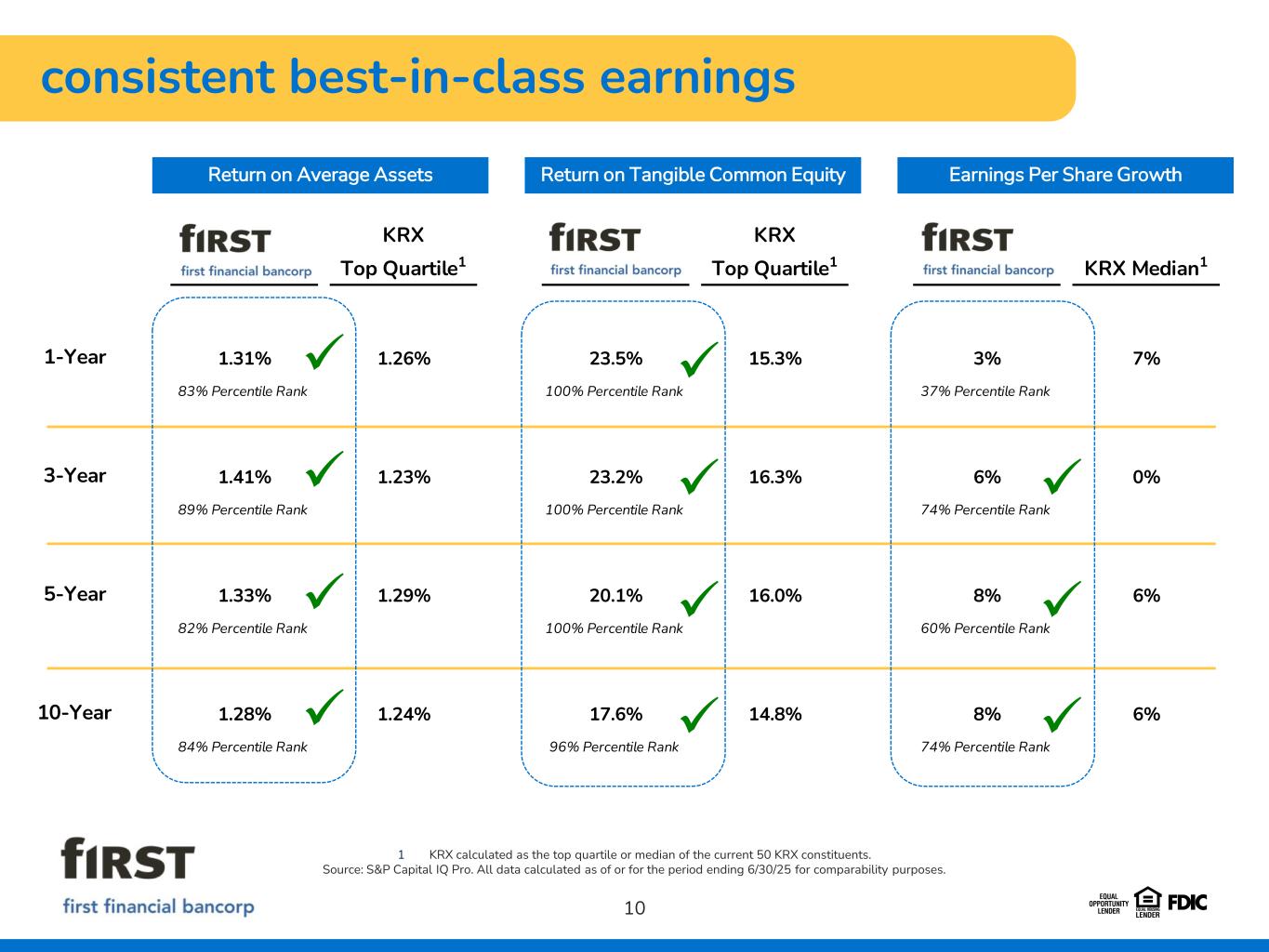 KRX Constituents FFBC Bottom Top Q3 Quartile Median Quartile Actual ROAA 1.03% 1.25% 1.44% 1.54% ROATCE 13.3% 14.9% 16.9% 19.1% Net Interest Margin 3.25% 3.47% 3.80% 4.02% Noninterest Income / Net Revenue 13.6% 18.1% 22.1% 31.4% Loans + HTM / Deposits 97% 92% 86% 82% Cash + AFS Securities / Assets 14% 16% 21% 22% ACL / Gross Loans 1.07% 1.22% 1.35% 1.38% NPAs / Assets 0.64% 0.50% 0.36% 0.41% CET1 Ratio 11.2% 12.1% 13.7% 12.9% Total RBC Ratio 14.1% 14.8% 16.0% 15.3% Consolidated CRE / RBC1 266% 212% 180% 194% a top quartile performer 9 Top Quartile & Diversified Profitability Liquid Balance Sheet With Strong Credit and Capital Indicates Peer Top Quartile Indicates Peer Median 1 Data for the quarter ending 6/30/25 for comparability purposes. CRE balances per bank regulatory filings. Source: S&P Capital IQ Pro. All data calculated as of or for the quarter ending 9/30/25 unless otherwise noted and excludes the impact of Westfield Bancorp and BankFinancial acquisitions.
