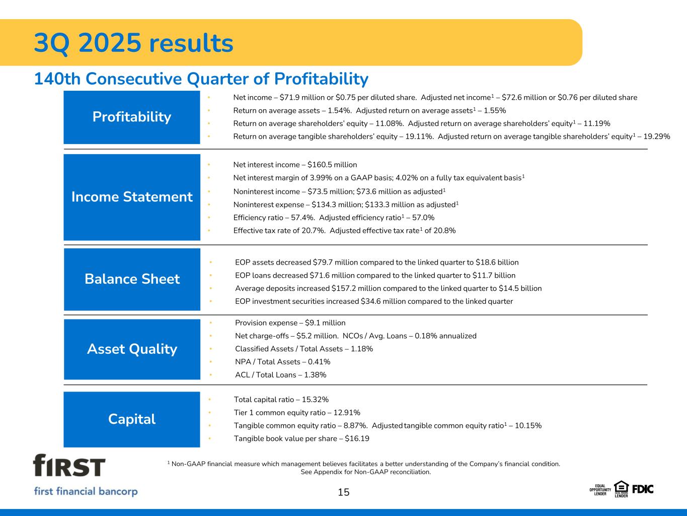 3Q 2025 results 140th Consecutive Quarter of Profitability 15 • EOP assets decreased $79.7 million compared to the linked quarter to $18.6 billion • EOP loans decreased $71.6 million compared to the linked quarter to $11.7 billion • Average deposits increased $157.2 million compared to the linked quarter to $14.5 billion • EOP investment securities increased $34.6 million compared to the linked quarter Balance Sheet Profitability Asset Quality Income Statement Capital • Noninterest income – $73.5 million; $73.6 million as adjusted1 • Noninterest expense – $134.3 million; $133.3 million as adjusted1 • Efficiency ratio – 57.4%. Adjusted efficiency ratio1 – 57.0% • Effective tax rate of 20.7%. Adjusted effective tax rate1 of 20.8% • Net interest income – $160.5 million • Net interest margin of 3.99% on a GAAP basis; 4.02% on a fully tax equivalent basis1 • Net income – $71.9 million or $0.75 per diluted share. Adjusted net income1 – $72.6 million or $0.76 per diluted share • Return on average assets – 1.54%. Adjusted return on average assets1 – 1.55% • Return on average shareholders’ equity – 11.08%. Adjusted return on average shareholders’ equity1 – 11.19% • Return on average tangible shareholders’ equity – 19.11%. Adjusted return on average tangible shareholders’ equity1 – 19.29% • Provision expense – $9.1 million • Net charge-offs – $5.2 million. NCOs / Avg. Loans – 0.18% annualized • Classified Assets / Total Assets – 1.18% • NPA / Total Assets – 0.41% • ACL / Total Loans – 1.38% • Total capital ratio – 15.32% • Tier 1 common equity ratio – 12.91% • Tangible common equity ratio – 8.87%. Adjusted tangible common equity ratio1 – 10.15% • Tangible book value per share – $16.19 1 Non-GAAP financial measure which management believes facilitates a better understanding of the Company’s financial condition. See Appendix for Non-GAAP reconciliation.