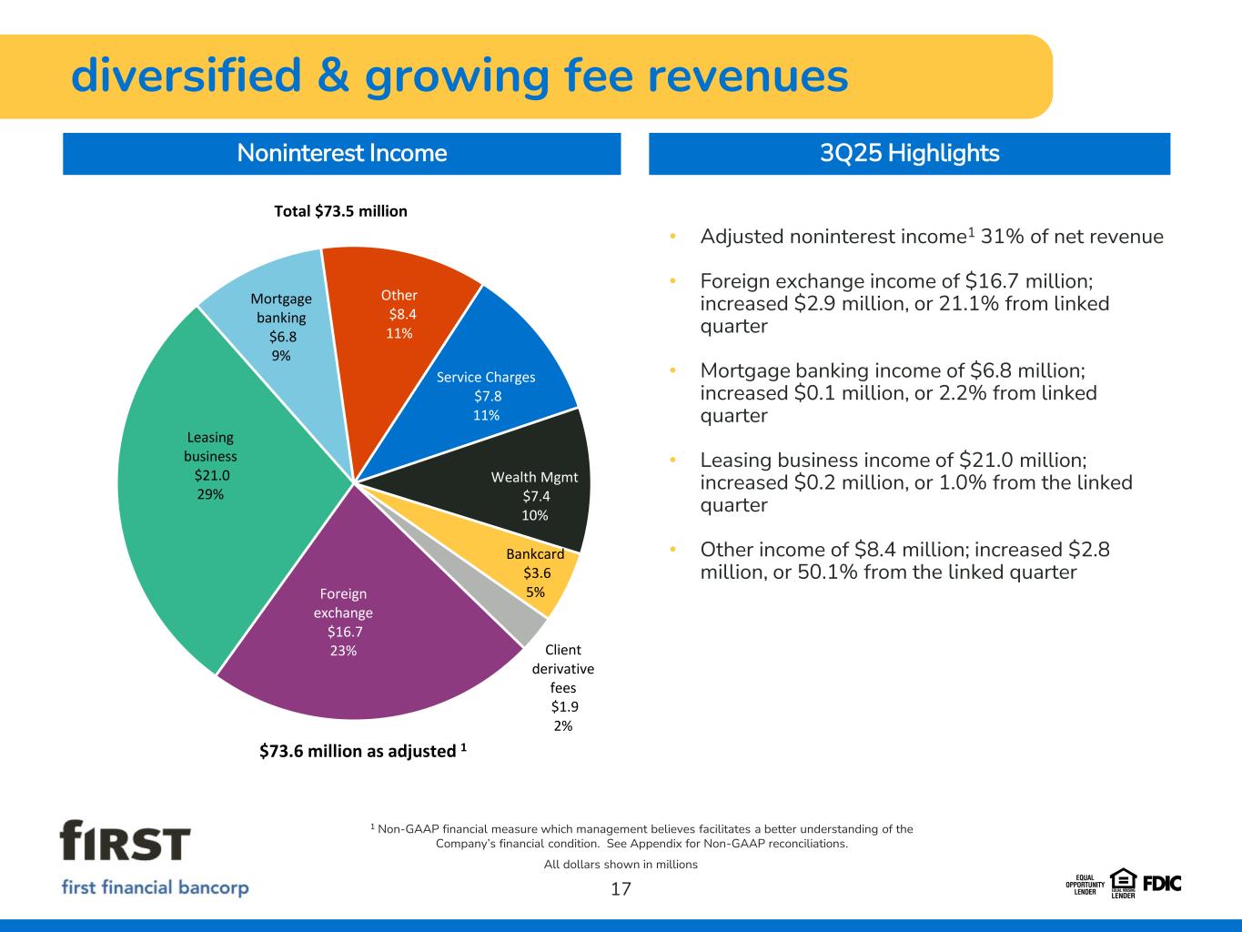 consistent & high levels of profitability 16 Return on Average Assets Return on Avg Tangible Common Equity Diluted EPS 1 Non-GAAP financial measure which management believes facilitates a better understanding of the Company’s financial condition. See Appendix for Non-GAAP reconciliation. $0.75$0.73 $0.54 $0.68 $0.55 $0.76 $0.74 $0.63 $0.71 $0.67 3Q252Q251Q254Q243Q24 Diluted EPS Adjusted EPS 1 19.11%19.61% 15.16% 19.08% 16.29% 19.29%19.76% 17.80% 19.90%19.77% 3Q252Q251Q254Q243Q24 ROATCE Adjusted ROATCE 1 Adjusted Pre-tax, Pre-Provision Earnings1 1.54%1.52% 1.13% 1.41% 1.17% 1.55%1.54% 1.33% 1.47%1.42% 3Q252Q251Q254Q243Q24 ROAA Adjusted ROAA1 $100.7$98.5 $83.7 $93.2$89.7 2.15% 2.14% 1.85% 2.03%2.00% 3Q252Q251Q254Q243Q24 Pre-tax, pre-provision earnings Pre-tax, pre-provision ROAA11
